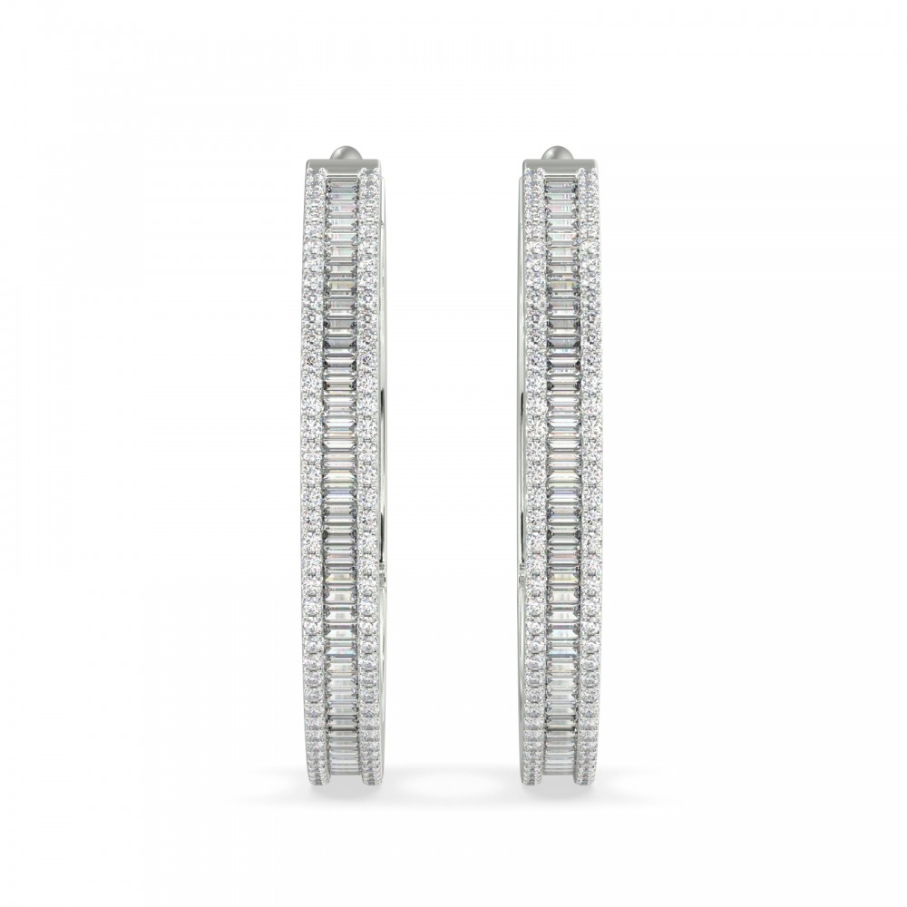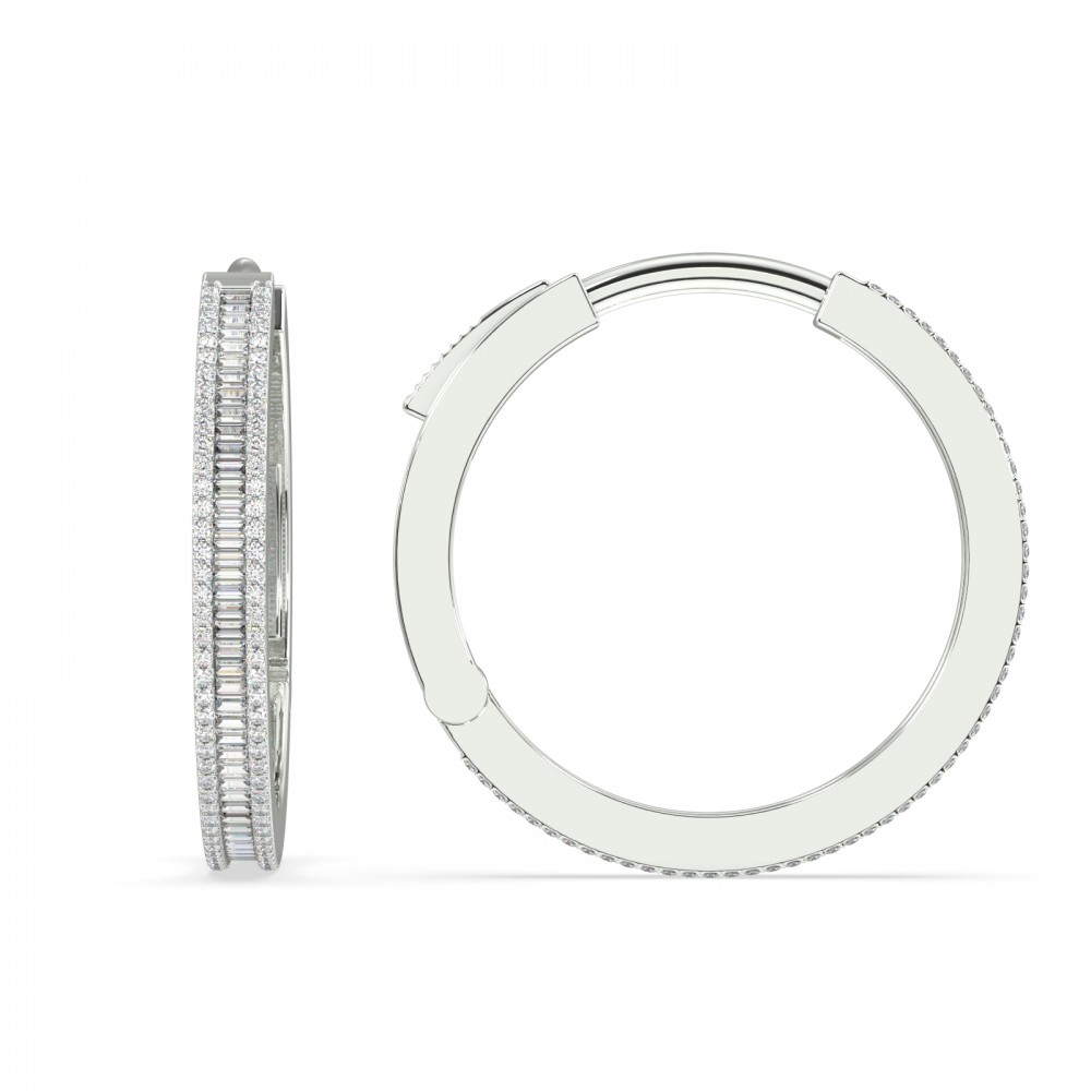 Earrings in 18 K white gold with 1.02 ct. baget diamonds and 0.75 ct. round diamonds. The weight of the earrings is 12.86 grams. Inside diameter 2.5 cm