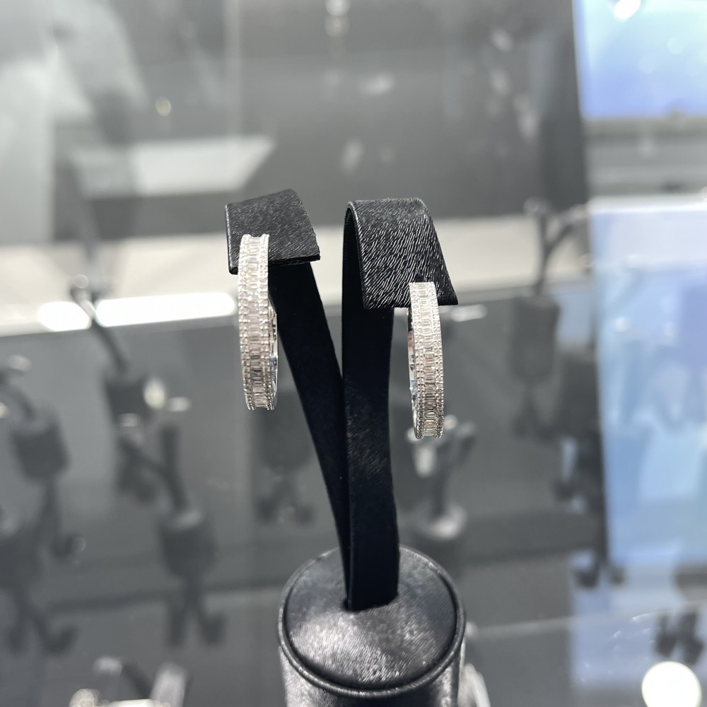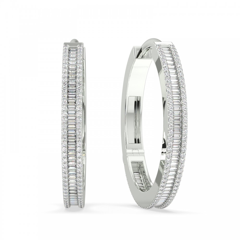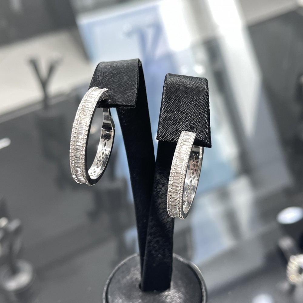 Earrings in 18 K white gold with 1.02 ct. baget diamonds and 0.75 ct. round diamonds. The weight of the earrings is 12.86 grams. Inside diameter 2.5 cm Go to "SPECIFICATIONS" for more details about this product.
