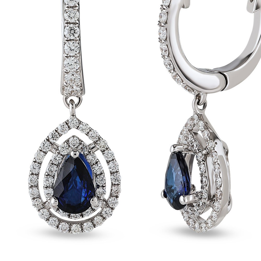 Earrings in 14 K white gold with 16 diamonds of 0.20 ct., 80 diamonds of 0.33 ct. and 2 sapphires of 1.11 ct. The weight of the earrings is 3.71 grams.