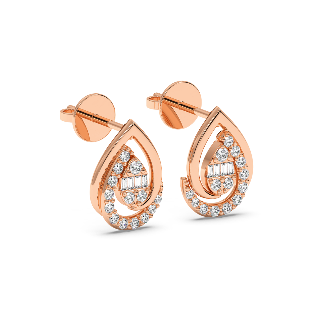 14 K gold earrings with baget diamonds of 0.04ct and round diamonds of 0.19ct. The earrings weigh approximately 2 grams.