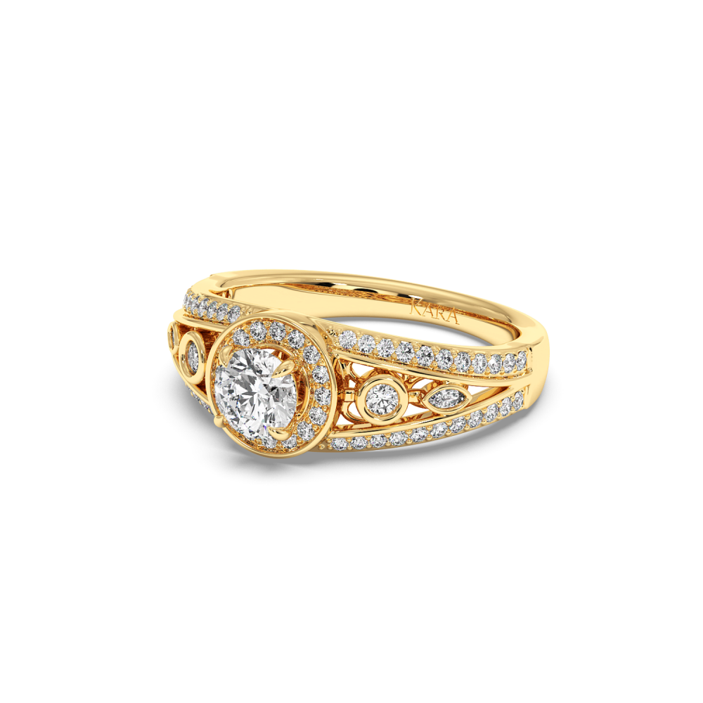 14K gold ring with a 0.50ct round center diamond, 0.34ct round side diamonds and 0.02ct Marquise Cut diamonds. The weight of the ring is approximately 4.30 grams. We can modify the design to suit your budget. We can choose the characteristics of the diamonds (cut, color, clarity, carat) to...