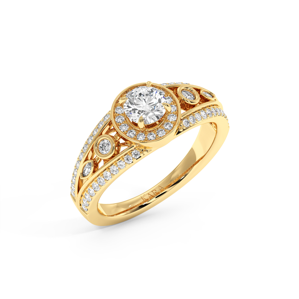 14K gold ring with a 0.50ct round center diamond, 0.34ct round side diamonds and 0.02ct Marquise Cut diamonds. The weight of the ring is approximately 4.30 grams.