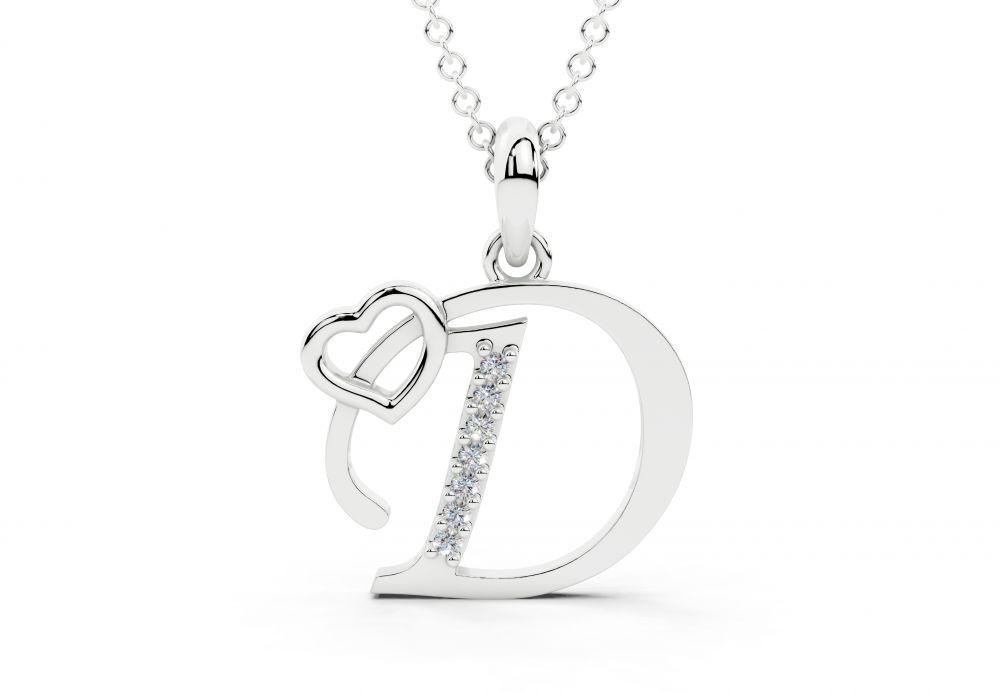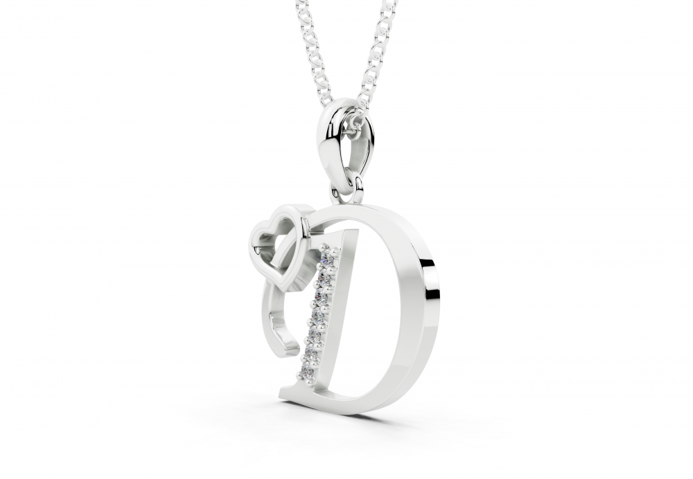 Initial D pendant in 14 K white gold with 0.03ct diamonds. The approximate weight of the pendant is 2.80 grams. Go to "SPECIFICATIONS" for more details about this product. We can customize any initial you wish.