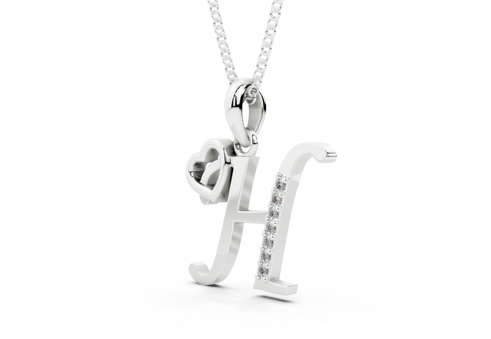 Initial H pendant in 14 K white gold with 0.03ct diamonds. The approximate weight of the pendant is 2.90 grams.