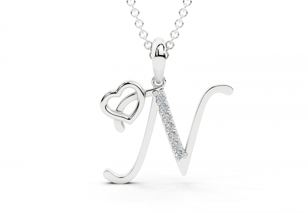 Initial N pendant in 14 K white gold with 0.03ct diamonds. The approximate weight of the pendant is 2.70 grams.