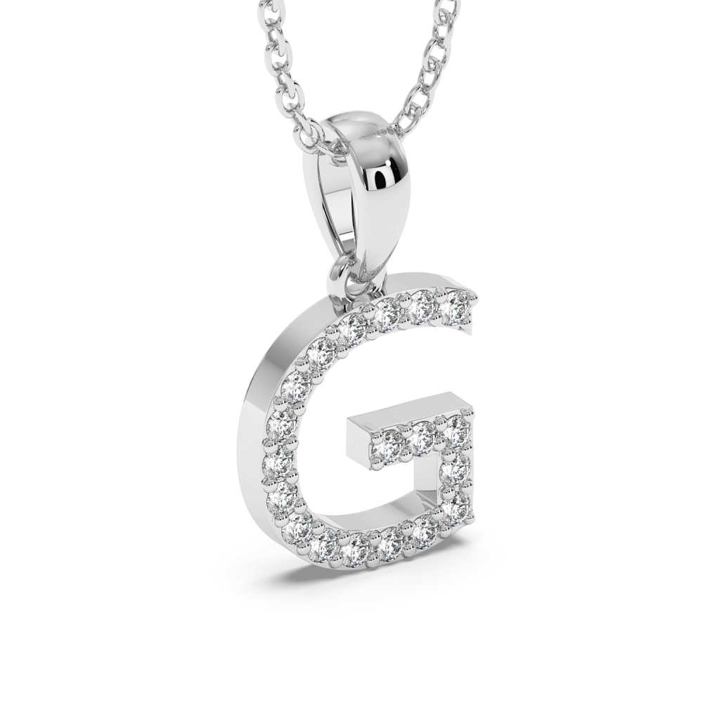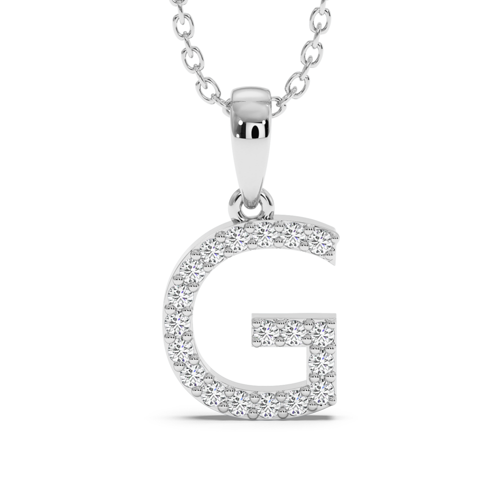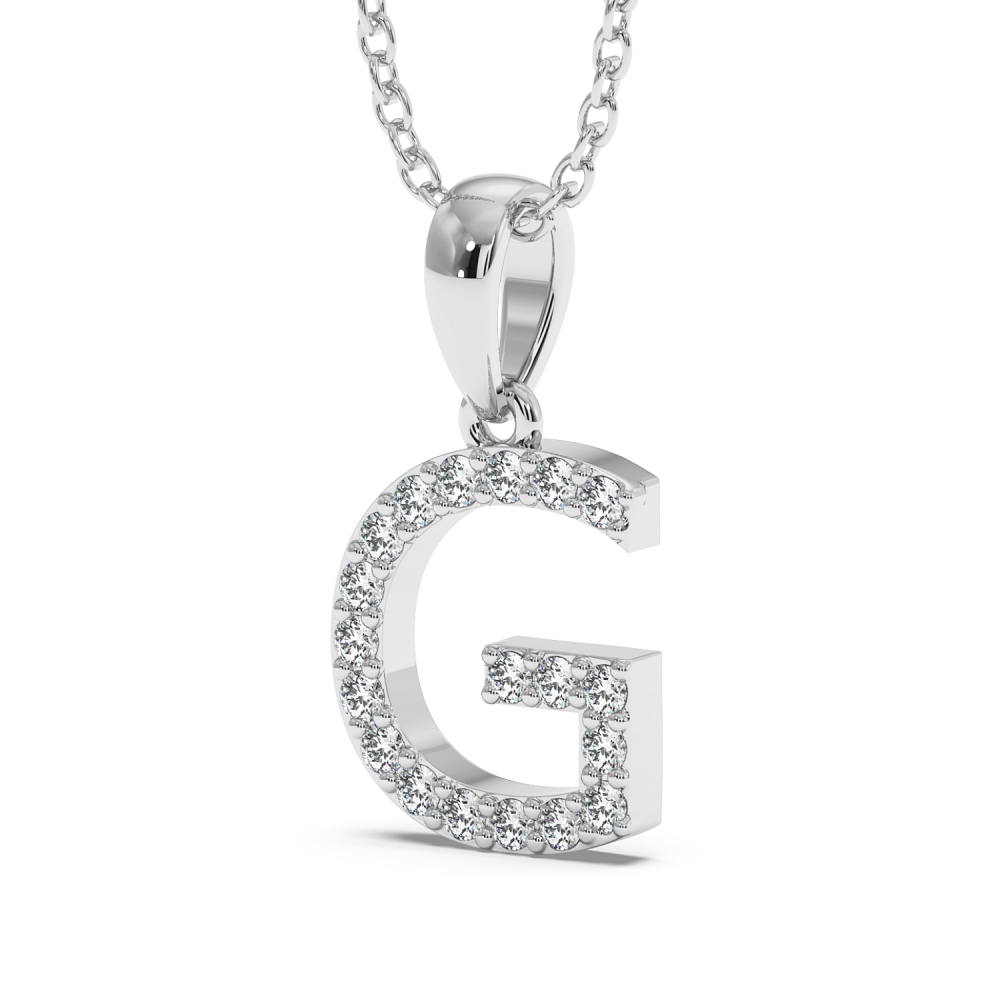 14 K white gold initial pendant with 0.08 ct diamonds. The pendant weighs 1.86 grams. Go to "SPECIFICATIONS" for more details about this product. For a correct diamond valuation, please refer to the chart below: We can custom make any initial you desire.
