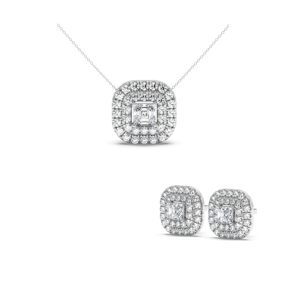 The diamond set includes: chain + earrings in 14K white gold with 0.86 ct Princess diamonds and 1.52 ct side diamonds. The total weight of the set is 8.00 grams.