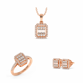 The diamond set includes: chain + pendant, earrings and ring in 14K white gold with 1.15 ct baget diamonds and 1.35 ct round diamonds. The total weight of the set is 10.11 grams.