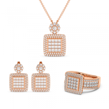 The set includes: 14K gold pendant chain with princess cut diamonds of 0.80ct and round diamonds of 0.44ct, ring with princess cut diamonds of 0.80ct and round diamonds of 0.44ct and earrings in 14K gold with princess cut diamonds of 0.64ct and round diamonds of 0.93ct. The total weight of the...