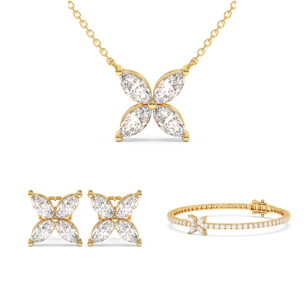 The set includes: 14K gold pendant chain with 1ct marquise diamonds, 14K gold earrings with 1.32ct marquise diamonds and bracelet with 0.66ct marquise diamonds and 4.09ct round diamonds. Total weight of the set is approximately 16 grams. Go to "SPECIFICATIONS" for more details about this...