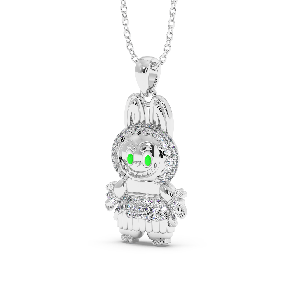 Labubu pendant in 14 K gold with 0.15ct diamonds. The pendant weighs approximately 3.70 grams. The pendant can also be made to order in 18K gold, yellow or rose white. We can modify the design according to your budget. We can choose the characteristics of the diamonds (cut, color, clarity,...
