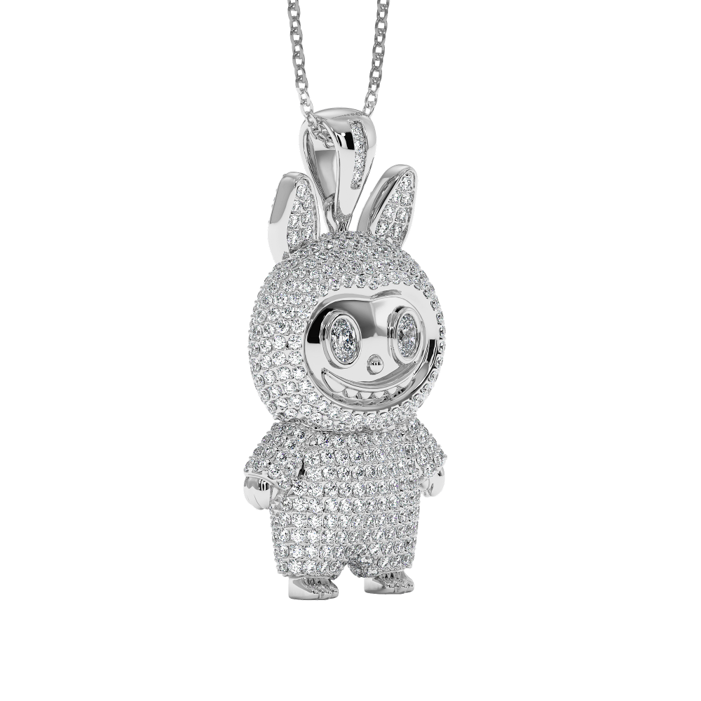 Labubu pendant in 14 K gold with 0.66ct diamonds. The pendant weighs approximately 5 grams. The pendant can also be made to order in 18K gold, yellow or rose white. We can modify the design according to your budget. We can choose the characteristics of the diamonds (cut, color, clarity,...