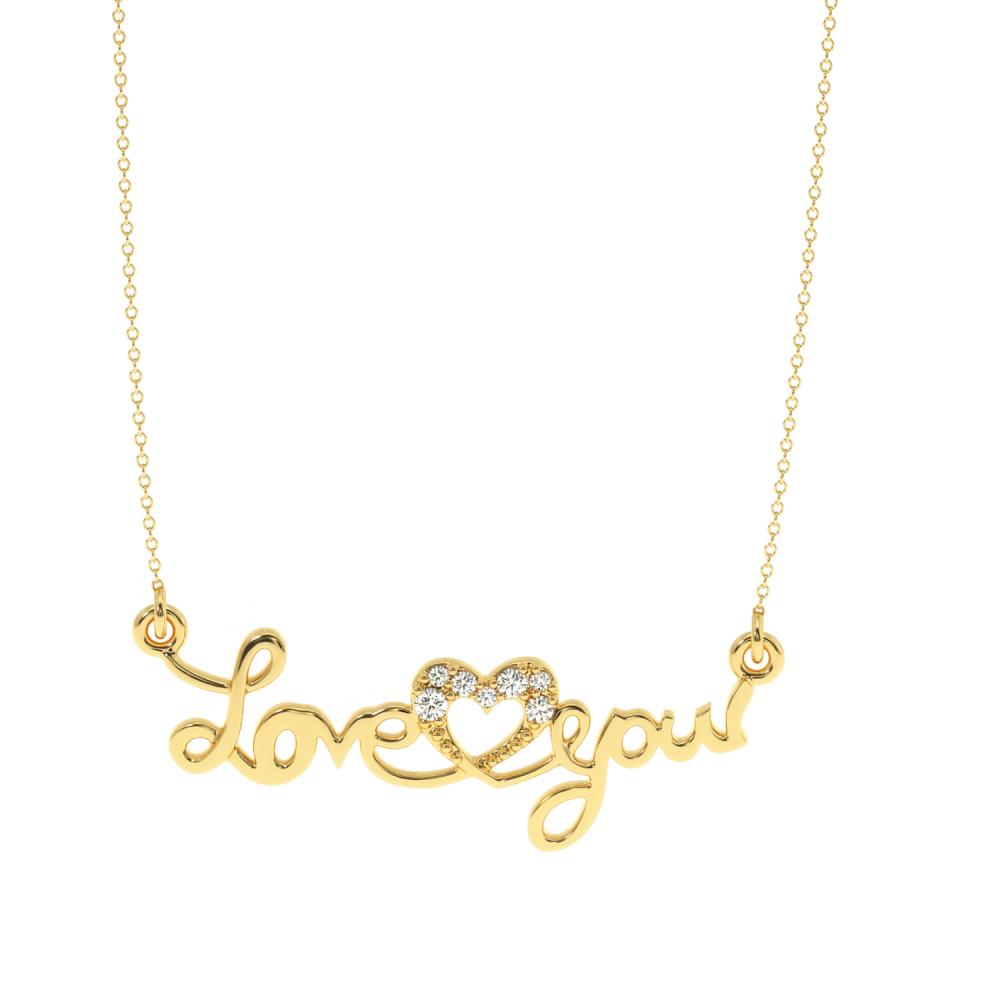 Love pendant in 14k gold, 0.06ct diamonds. Pendant weight is approximately 2.70 grams. Pendant width is 1.3cm. Chain length is 2cm. Go to "SPECIFICATIONS" for more details about this product.