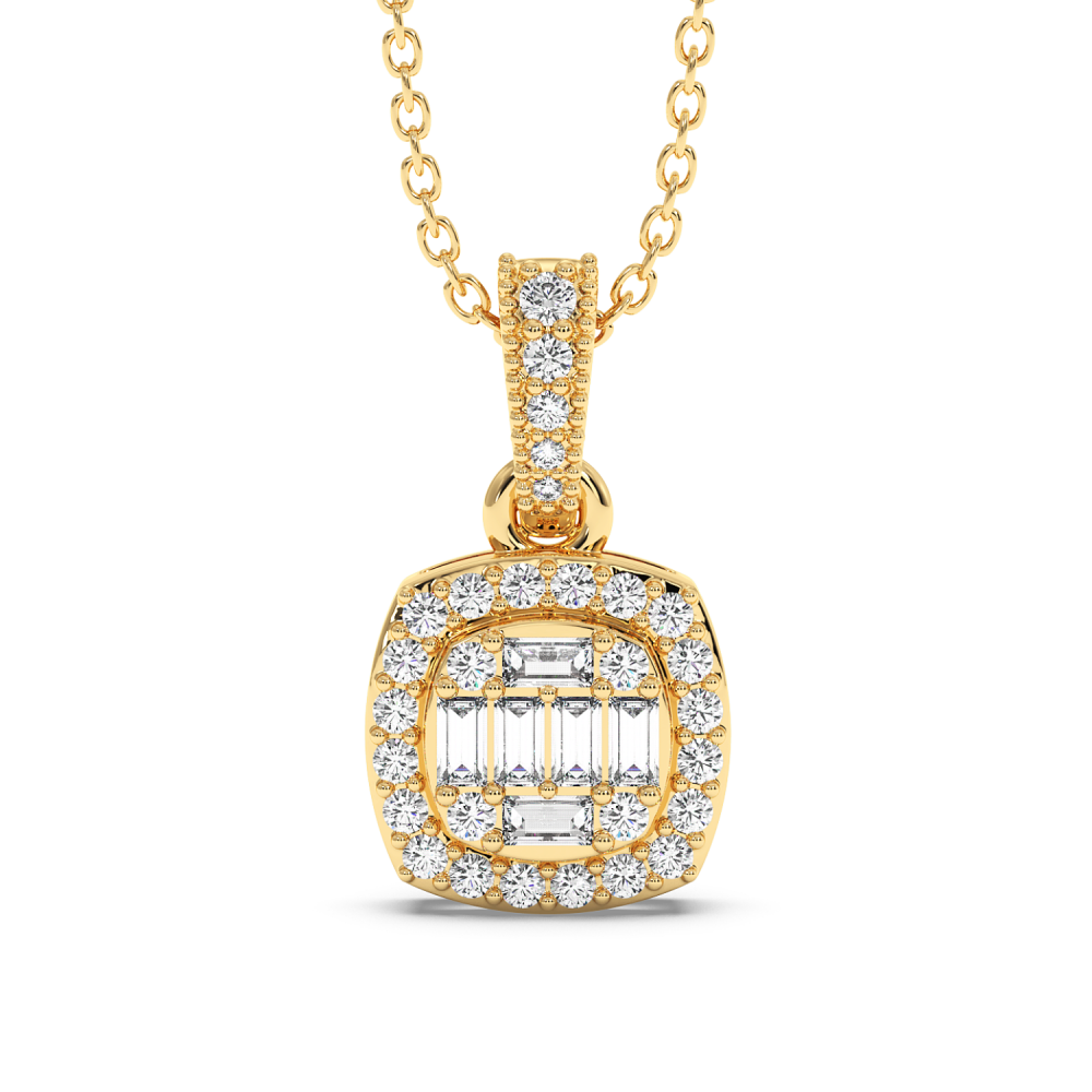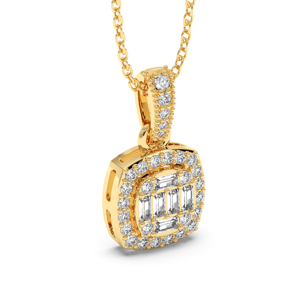 14 K white gold pendant with baget diamonds of 0.12 ct. and round diamonds of 0.23 ct. The weight of the necklace is 2.79 grams. Go to "SPECIFICATIONS" for more details about this product. For an accurate diamond valuation, please refer to the chart below: