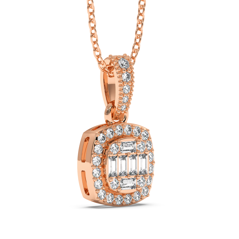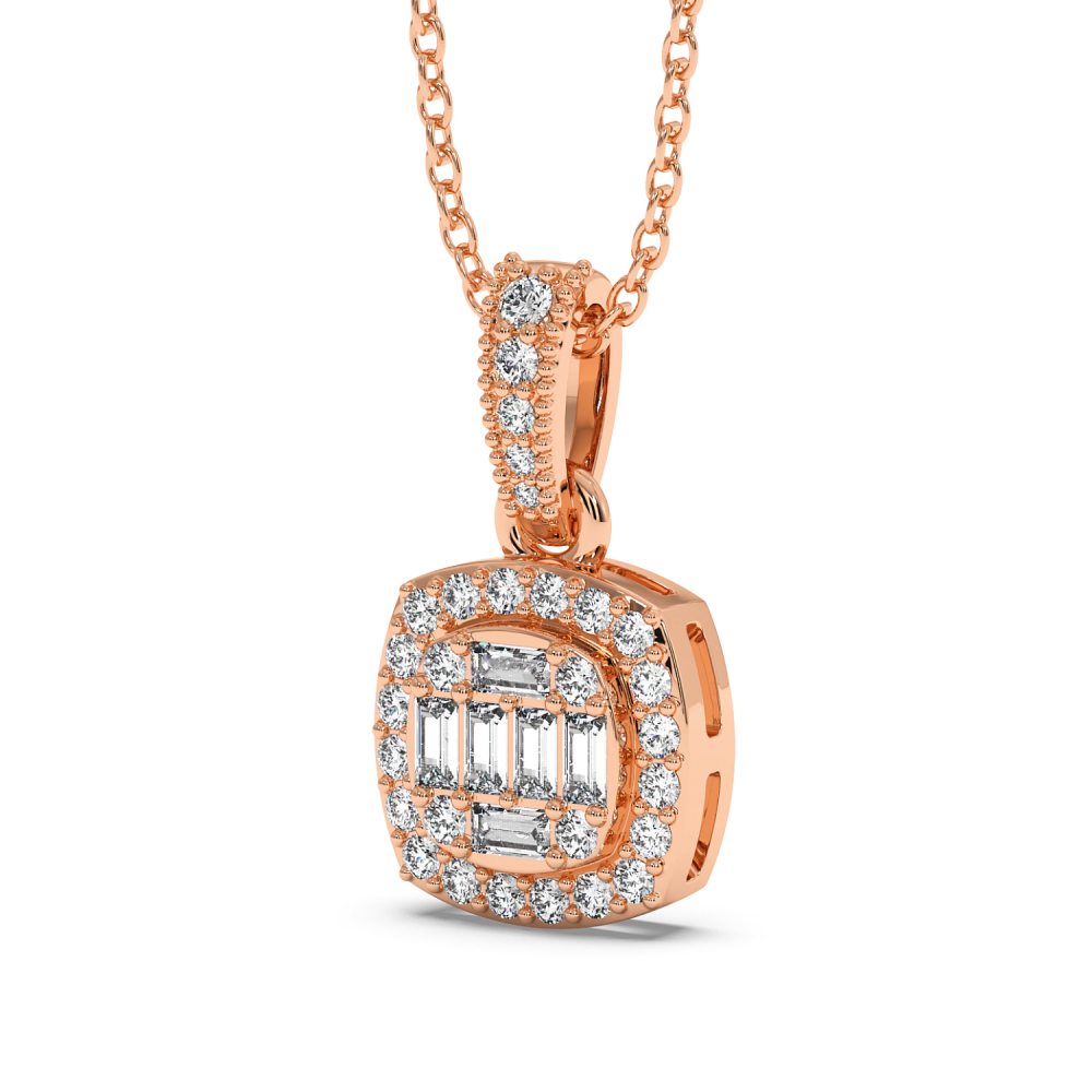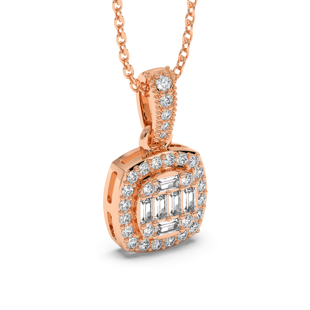 14 K white gold pendant with baget diamonds of 0.12 ct. and round diamonds of 0.23 ct. The weight of the necklace is 2.79 grams. Go to "SPECIFICATIONS" for more details about this product. For an accurate diamond valuation, please refer to the chart below: