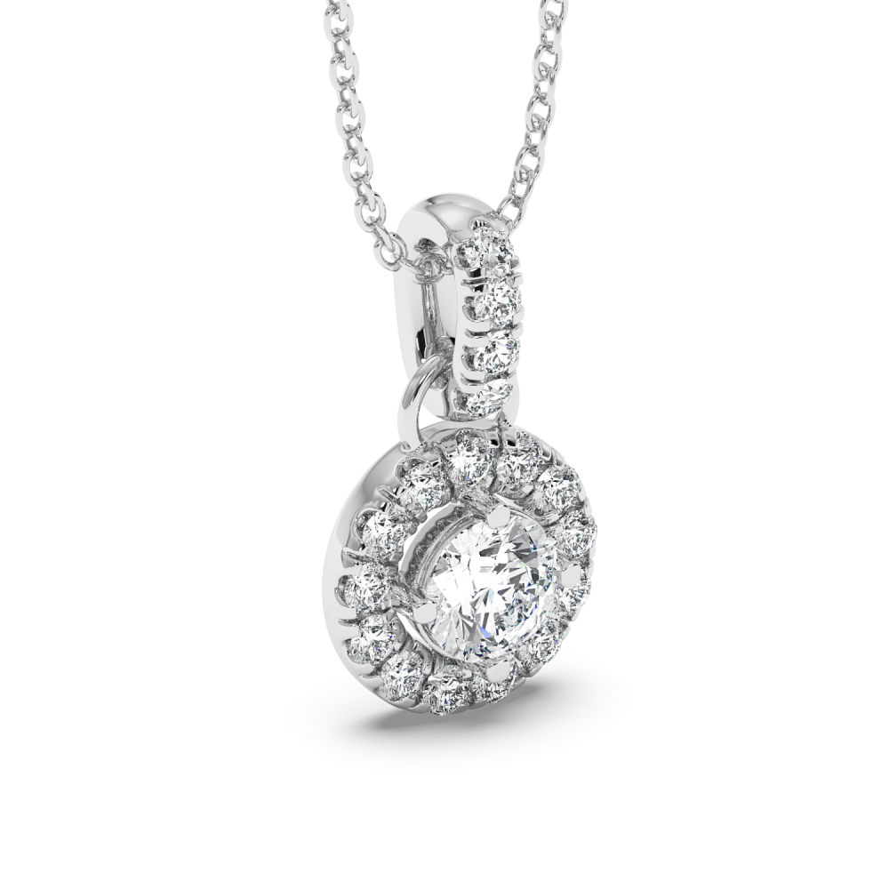Pendant in 14 K white gold, with central diamond of 0.45 ct and side diamonds of 0.39 ct. The weight of the necklace is approx 3.15 grams. It can be made in white, yellow or rose gold.