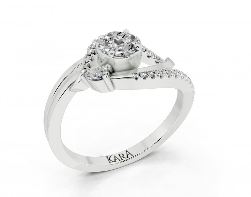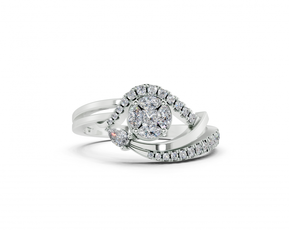 14K white gold ring, with Pear cut diamonds of 0.05 ct, Marquise Cut diamonds of 0.10 ct, Princess Cut diamonds of 0.04 ct and round diamonds of 0.12 ct. The weight of the ring is approximately 3.00 grams.