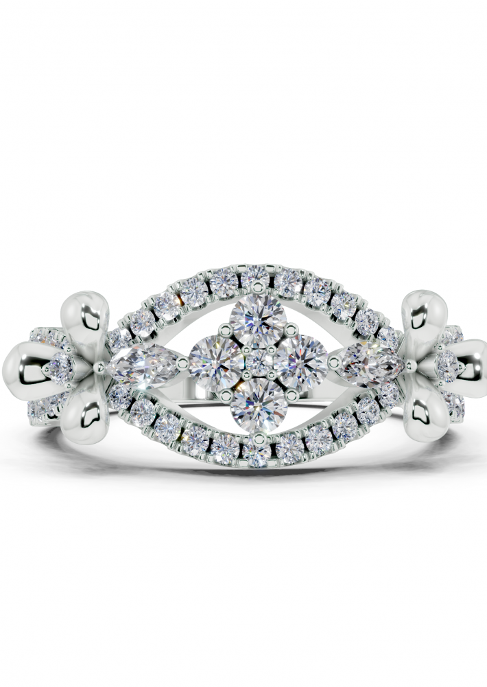 14K white gold ring with 0.07ct Marquise Cut diamonds and 0.50ct round diamonds. Ring weight is approximately 6 grams. The ring can also be made to order in 18K gold. We can modify the design according to your budget.