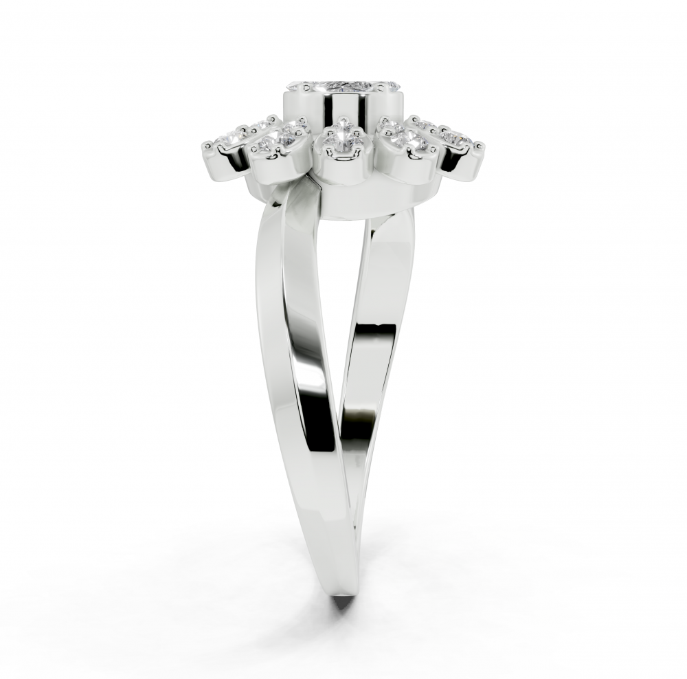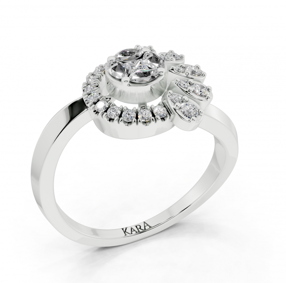 14K white gold ring with 0.10ct Marquise Cut diamonds, a 0.05ct Princess Cut diamond and 0.19ct round diamonds. The weight of the ring is approximately 3.50 grams. The ring can also be made to order in 18K gold. We can modify the design according to your budget.