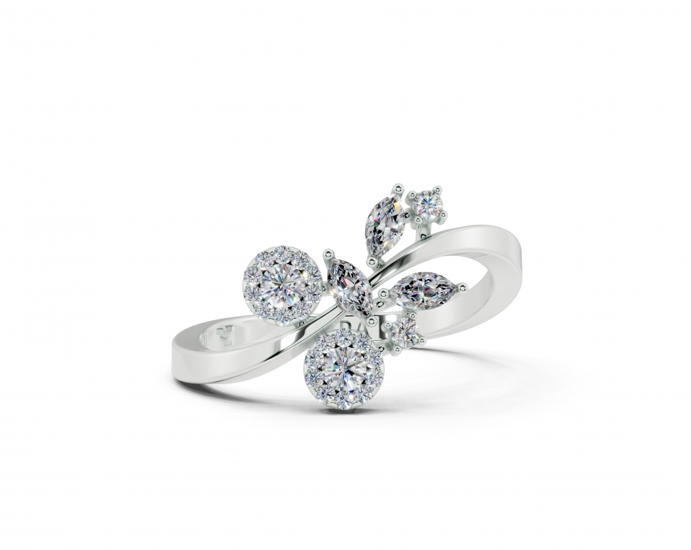 Ring in 14K white gold, with 0.11 ct Marquise Cut diamonds and 0.17 ct round diamonds. The weight of the ring is approximately 1.50 grams. The ring can also be made to order in 18K gold. We can modify the design according to your budget.