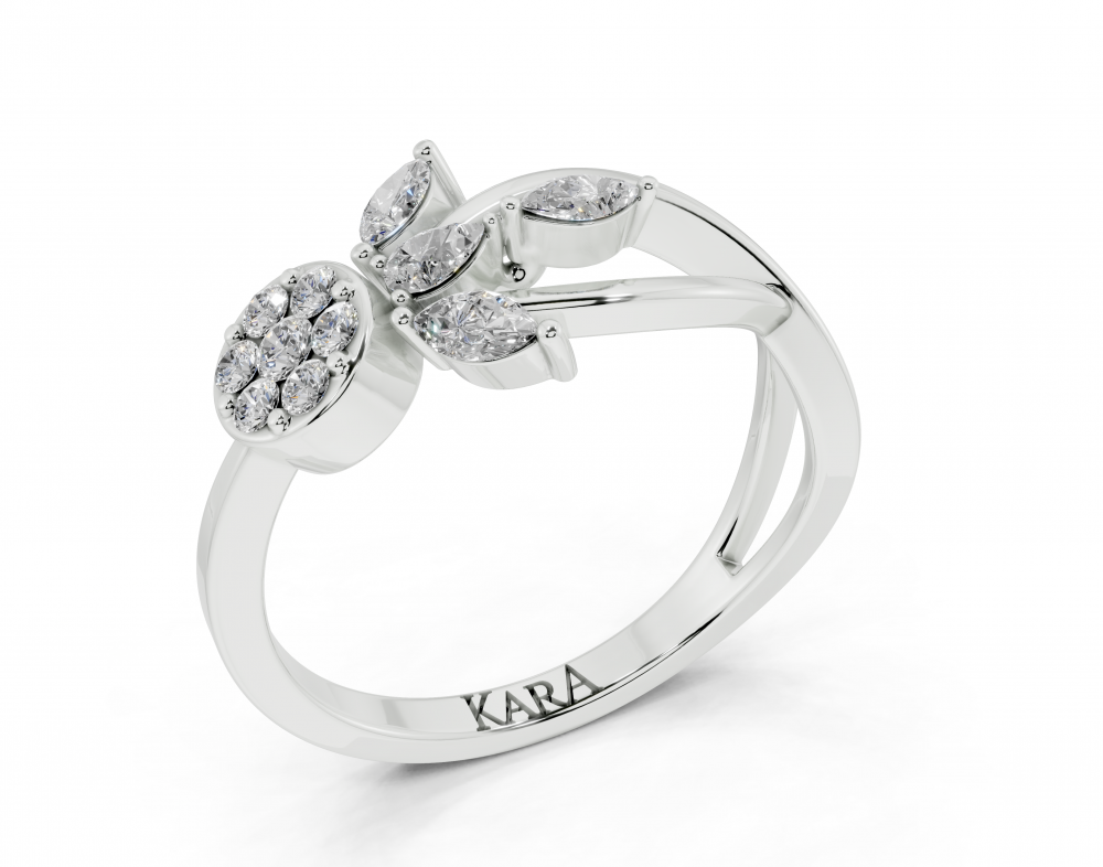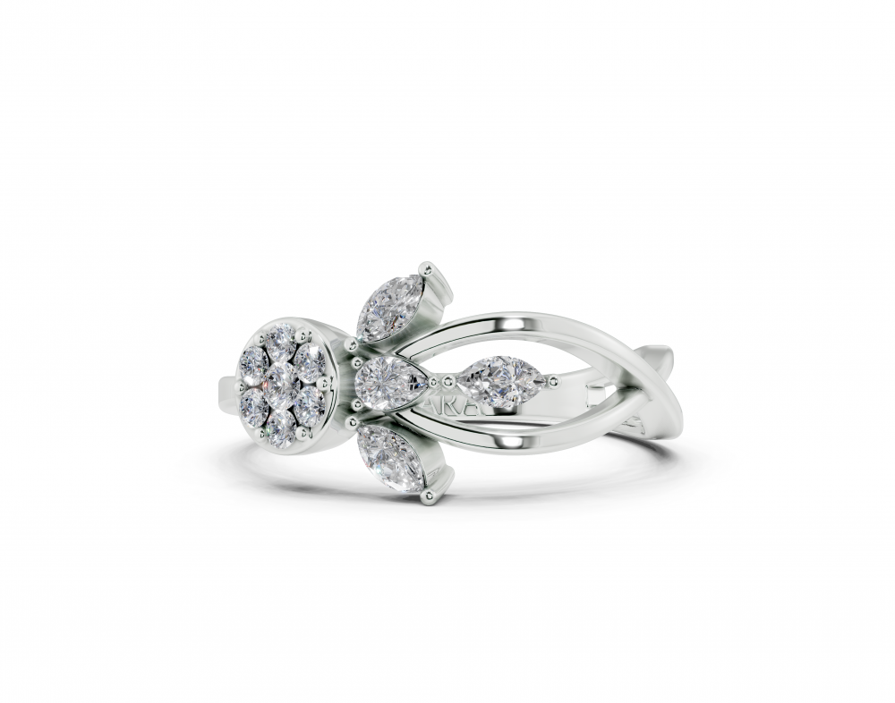 Ring in 14K white gold, with 0.11ct Marquise Cut diamonds, 0.11ct Pear Cut diamonds and 0.05ct round diamonds. Ring weight is approximately 2.50 grams. The ring can also be made to order in 18K gold. We can modify the design according to your budget.