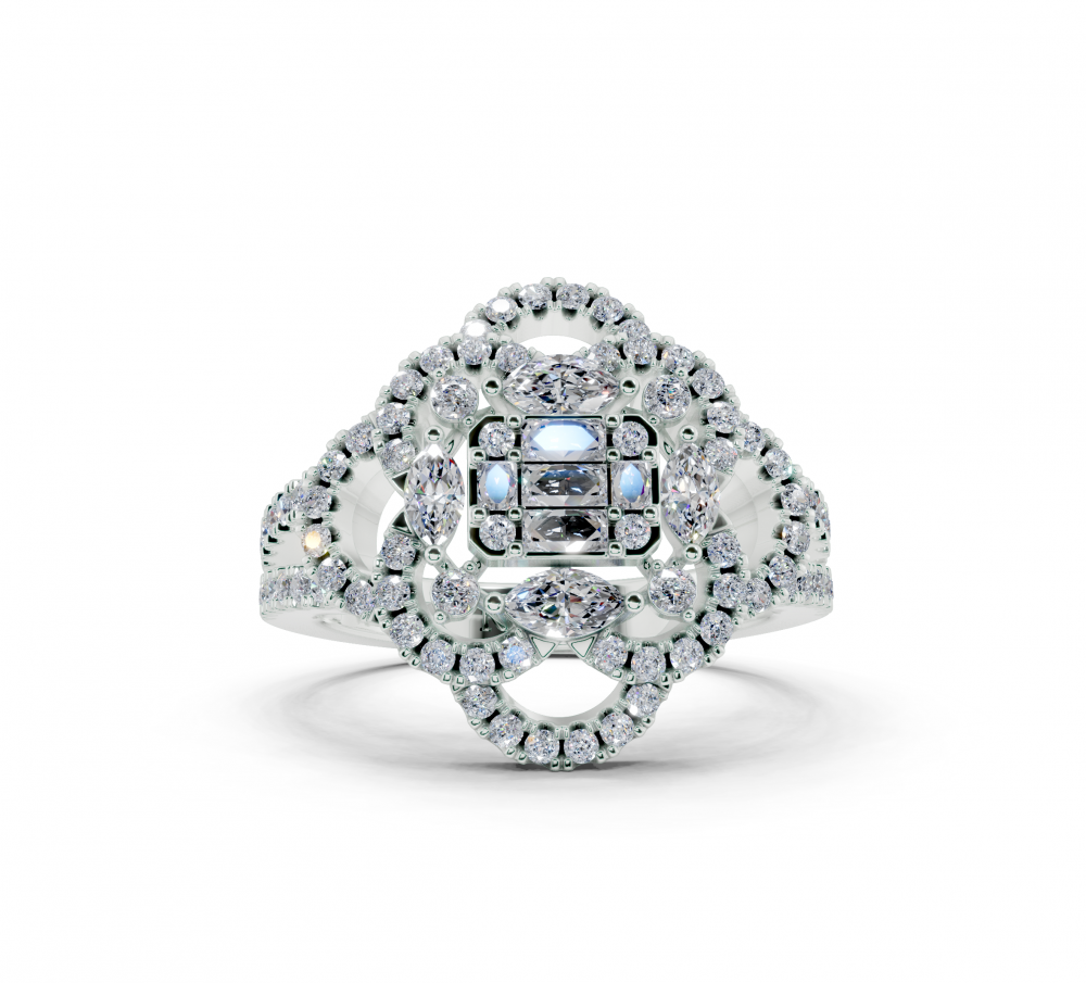 14K white gold ring with 0.14ct Baget diamonds, 0.18ct Marquise Cut diamonds and 0.51ct round diamonds. The weight of the ring is approximately 6 grams. The ring can also be made to order in 18K gold. We can modify the design according to your budget.