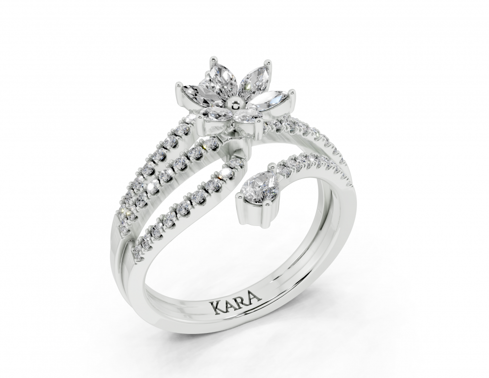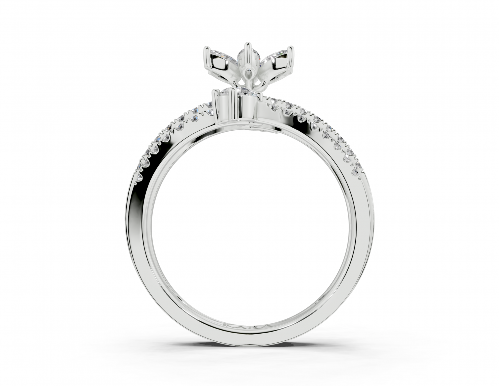 14K white gold ring with 0.15ct Pear Cut diamonds, 0.22ct Marquise Cut diamonds and 0.32ct round diamonds. Ring weight is approximately 4 grams. The ring can also be made to order in 18K gold. We can modify the design according to your budget.