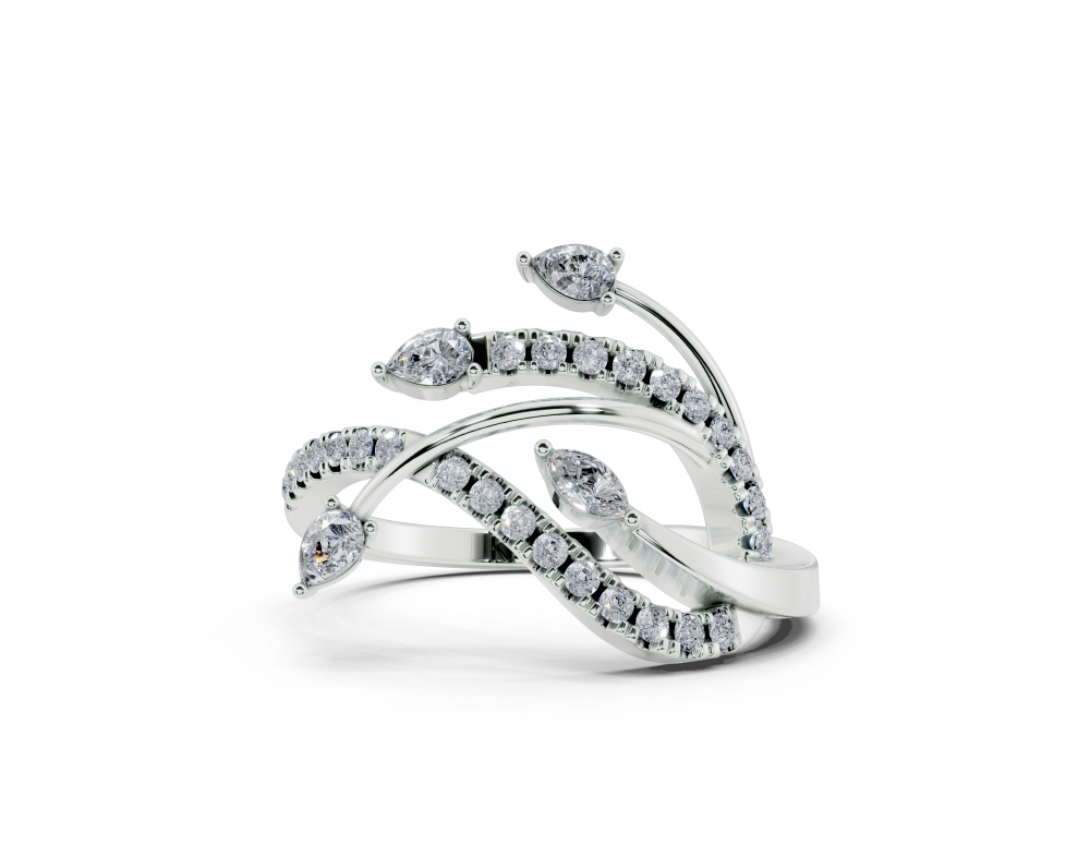 14K white gold ring with 0.17ct Pear Cut diamonds, 0.03ct Marquise Cut diamonds and 0.19ct round diamonds. Ring weight is approximately 3.00 grams. The ring can also be made to order in 18K gold. We can modify the design according to your budget.