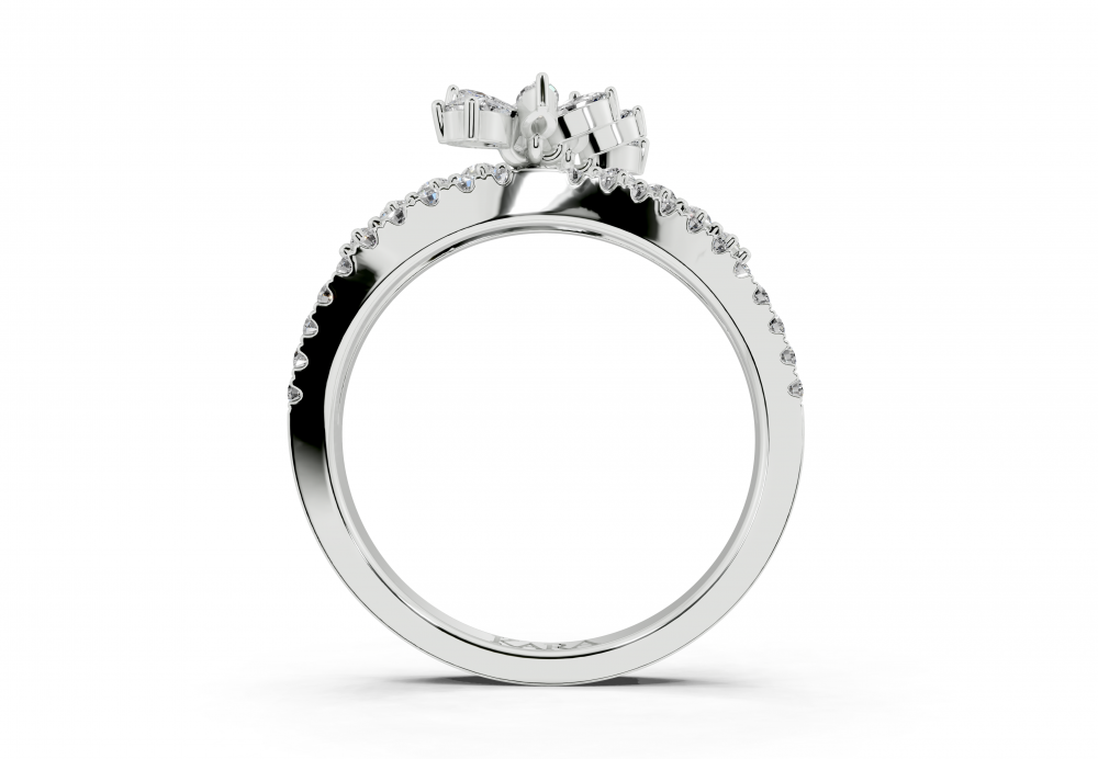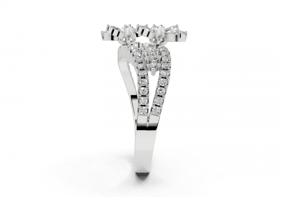 14K white gold ring with 0.18ct Marquise Cut diamonds, 0.10ct Pear Cut diamonds and 0.46ct round diamonds. Ring weight is approximately 4.50 grams. Go to "Specifications" for more details on this product.