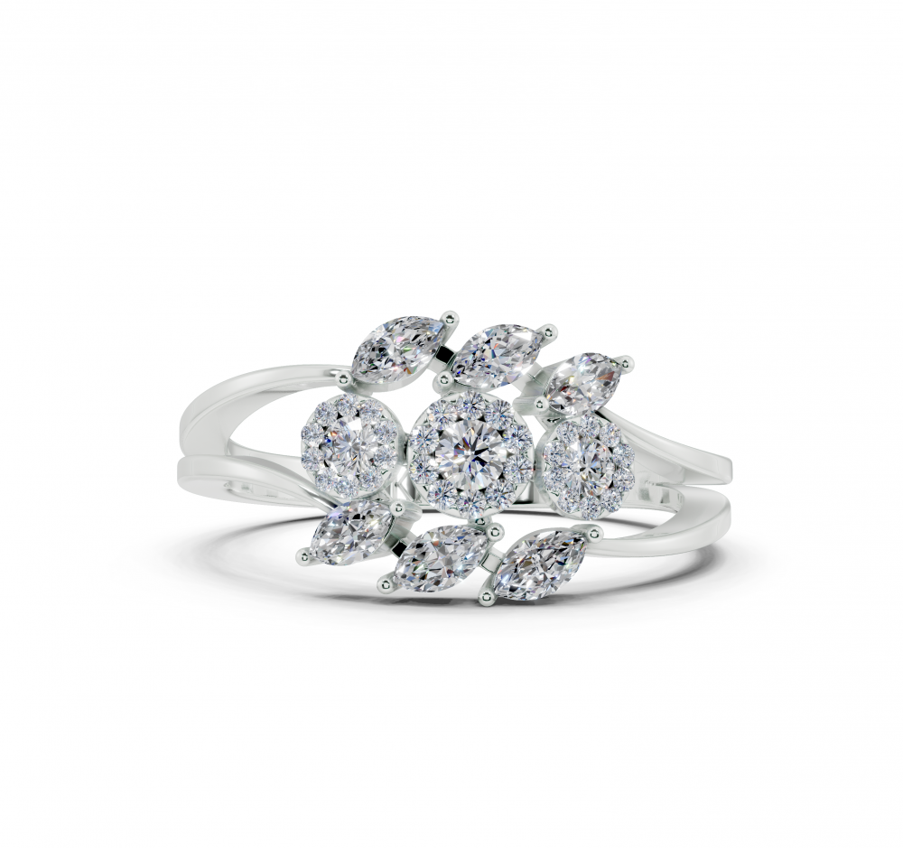 14K white gold ring with 0.22 ct Marquise Cut diamonds and 0.17 ct round diamonds. Ring weight is approximately 2.50 grams.