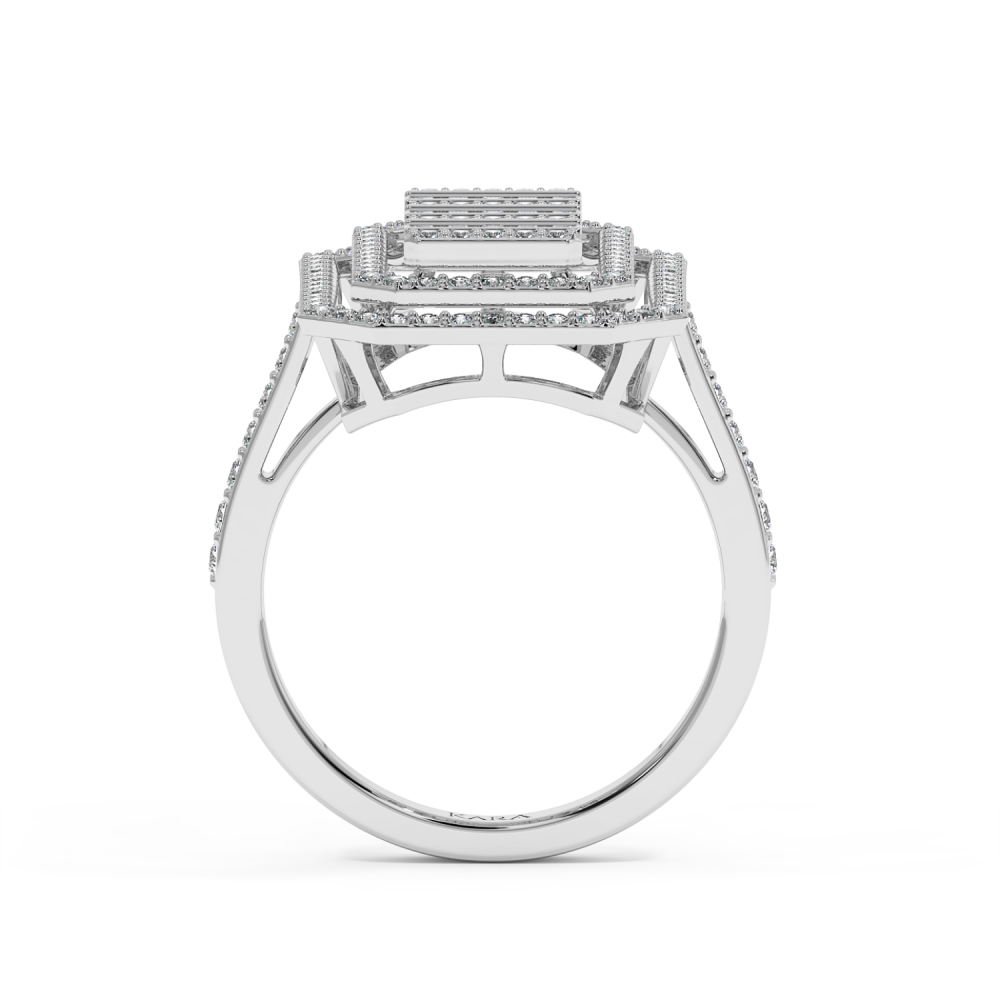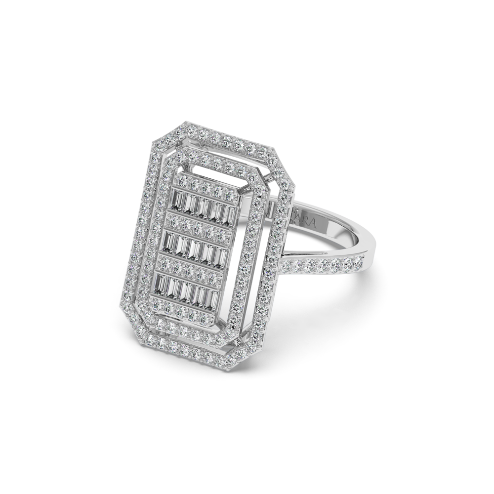 Ring in 14 k white gold with baguette diamonds of 0.23 ct and round diamonds of 0.67 ct. The weight of the ring is 4.75 grams. The ring can also be made to order in 18K gold. We can modify the design according to your budget. We can choose the characteristics of the diamonds (cut,...
