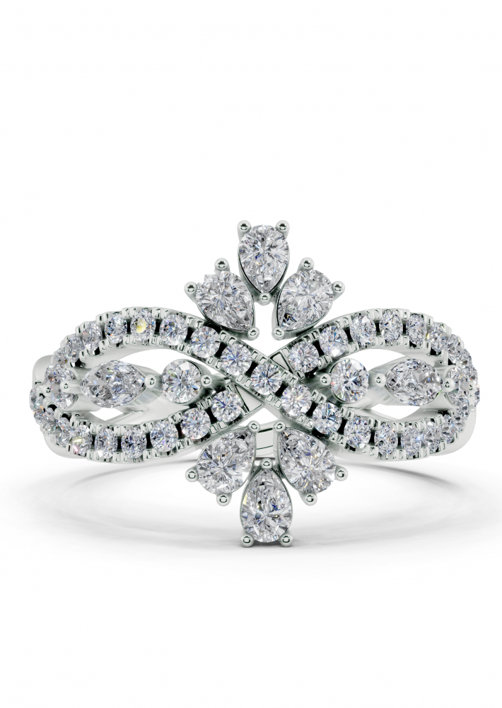 14K white gold ring with 0.31ct Pear Cut diamonds, 0.07ct Marquise Cut diamonds and 0.36ct round diamonds. Ring weight is approximately 5 grams. The ring can also be made to order in 18K gold. We can modify the design according to your budget.