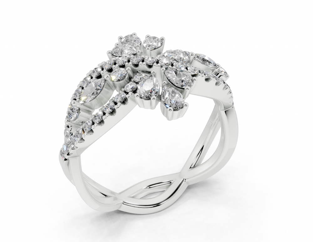 14K white gold ring with 0.31ct Pear Cut diamonds, 0.07ct Marquise Cut diamonds and 0.36ct round diamonds. Ring weight is approximately 5 grams.