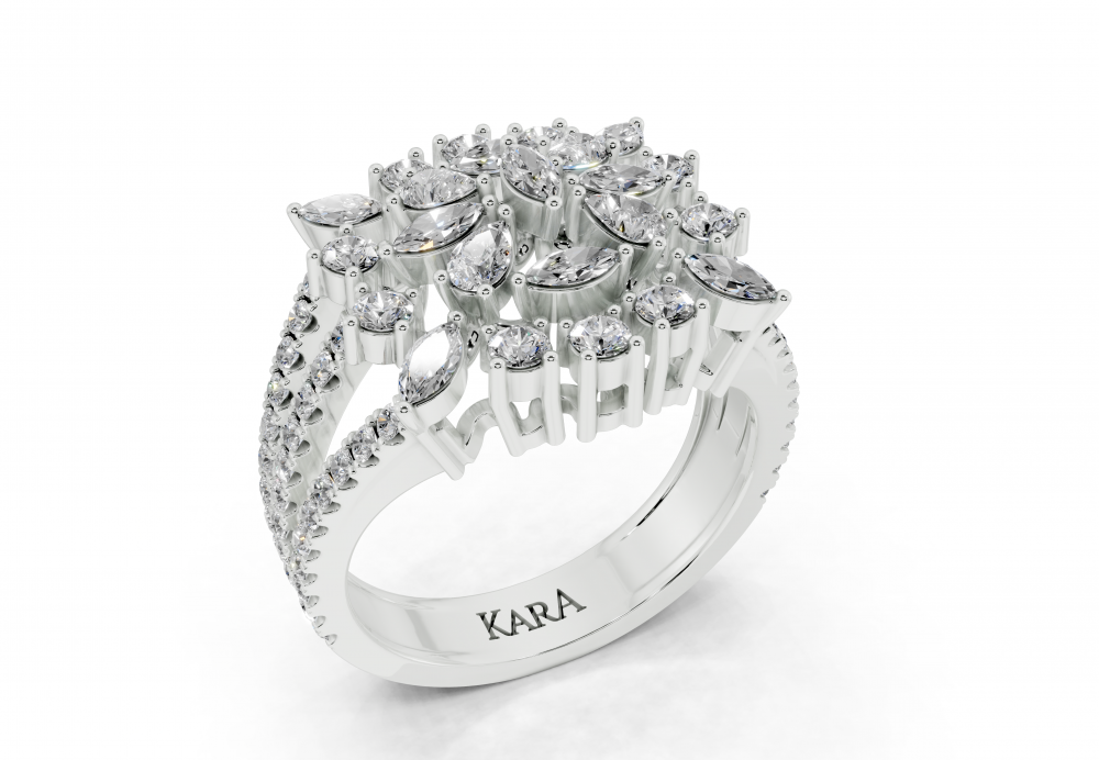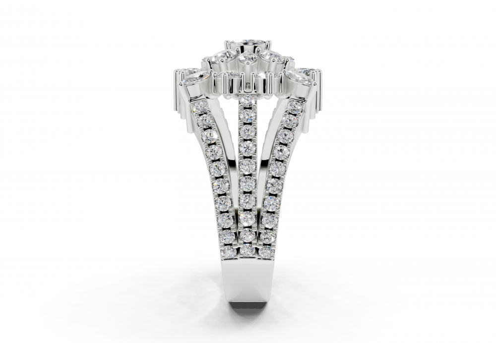 14K white gold ring, with 0.32ct Marquise Cut diamonds, 0.22ct Pear Cut diamonds and 0.79ct Round diamonds. Ring weight is approximately 6 grams.