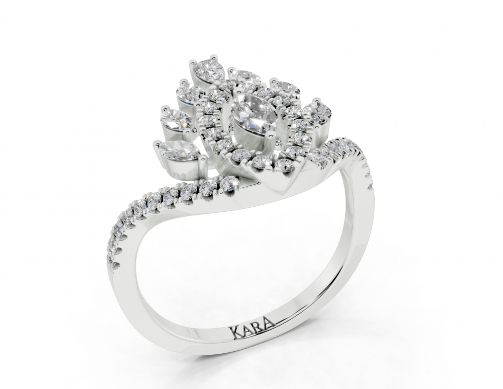 14K white gold ring with 0.32ct Marquise Cut diamonds, a 0.05ct Pear Cut diamond and 0.23ct round diamonds. The weight of the ring is approximately 3 grams. The ring can also be made to order in 18K gold. We can modify the design according to your budget.