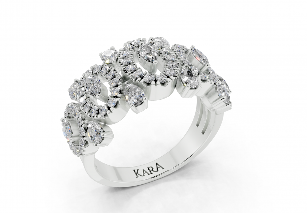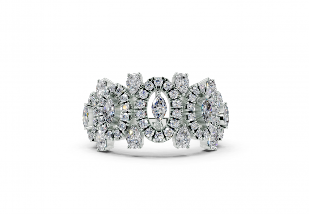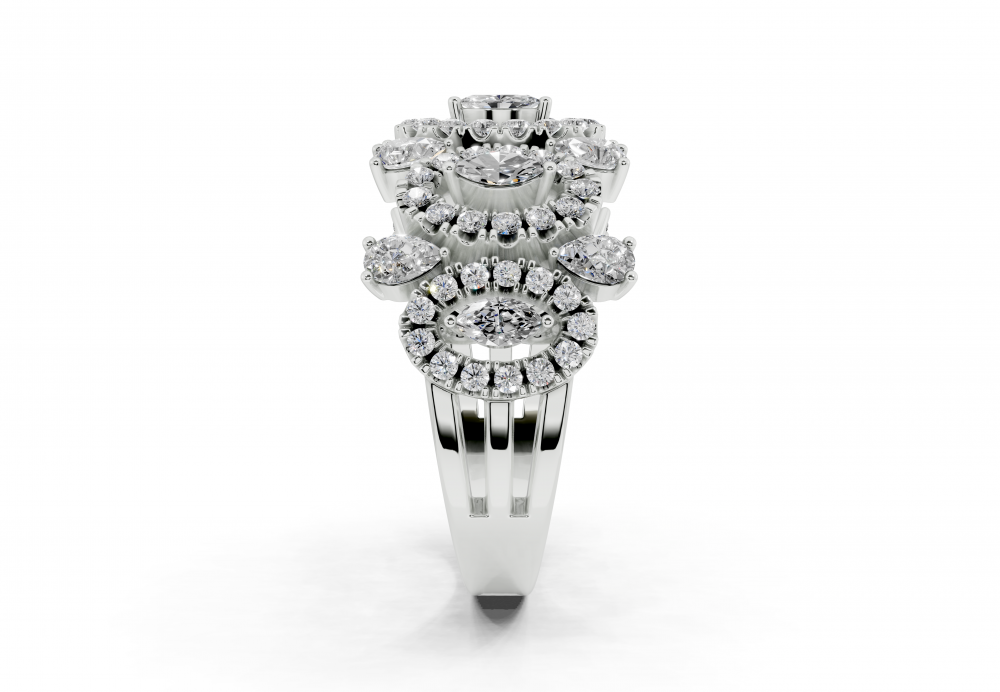 14K white gold ring with 0.41 ct Pear diamonds, 0.42 ct Round diamonds and 0.17 ct Marquise diamonds. Ring weight is approximately 5.50 grams. Go to "Specifications" for more details about this product.