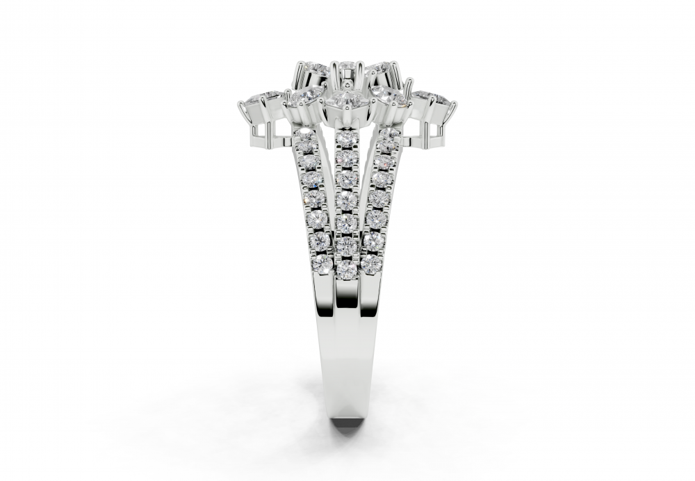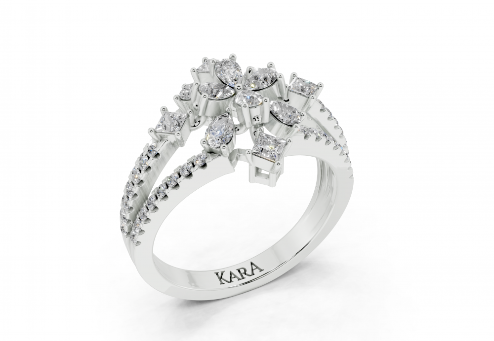 14K white gold ring, with 0.41ct Pear Cut diamonds, 0.24ct Princess Cut diamonds and 0.30ct round diamonds. The weight of the ring is approximately 5.50 grams.