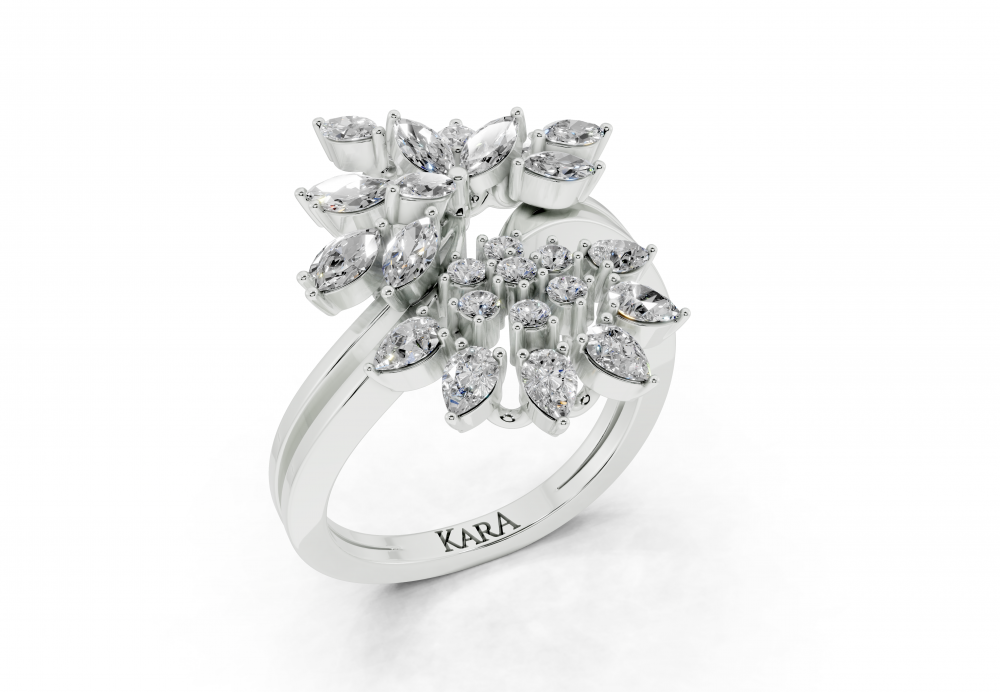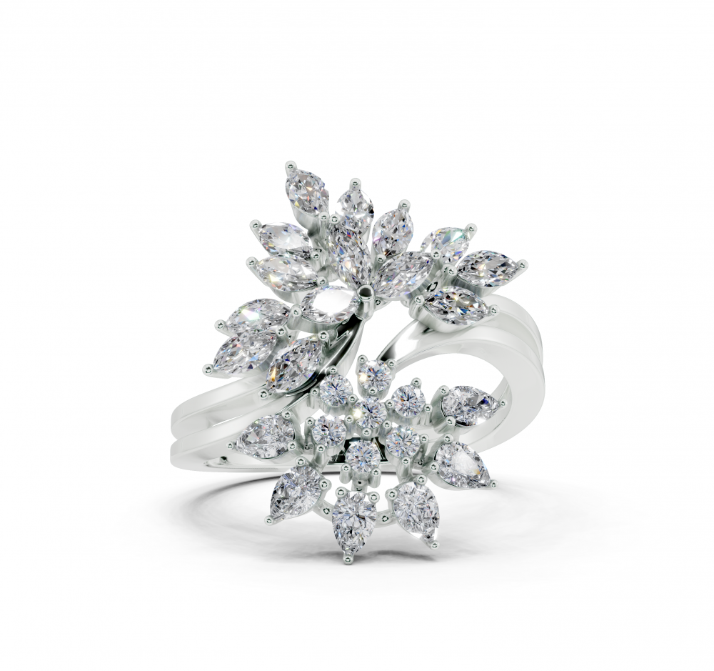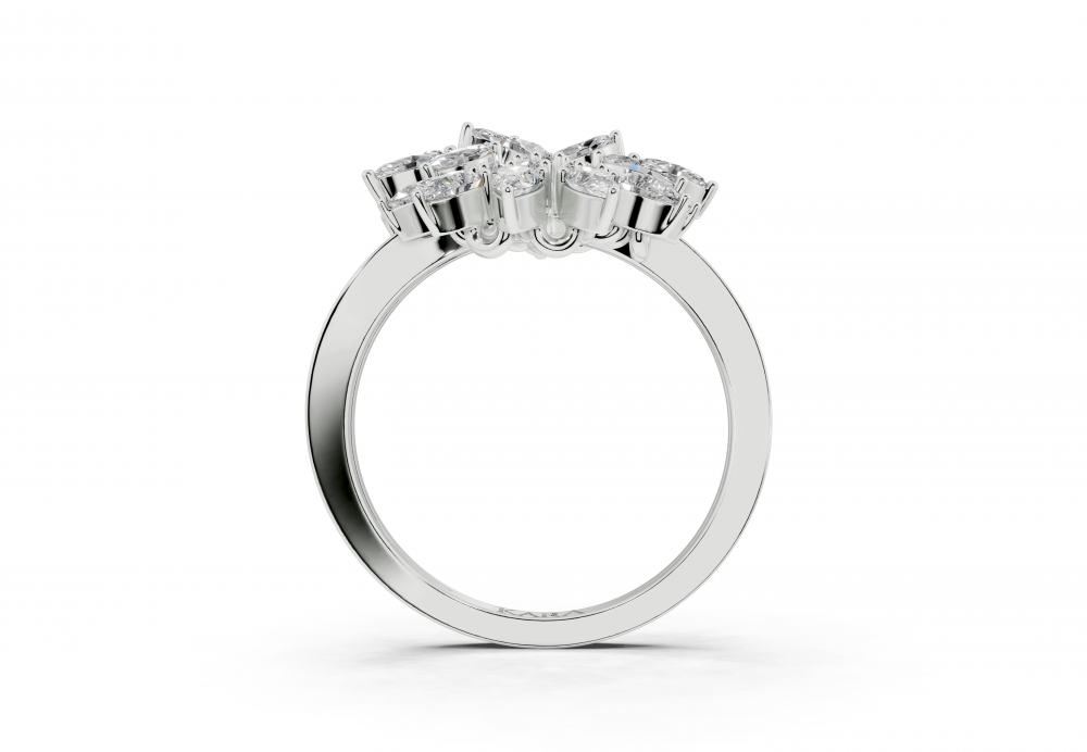 14K white gold ring with 0.52ct Marquise Cut diamonds, 0.31ct Pear Cut diamonds and 0.11ct round diamonds. Ring weight is approximately 4.50 grams. The ring can also be made to order in 18K gold. We can modify the design according to your budget.
