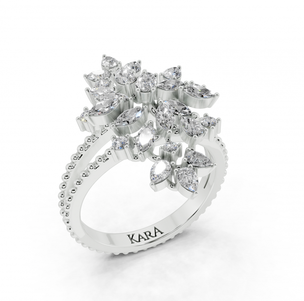 14K white gold ring with 0.57ct Pear Cut diamonds, 0.37ct Marquise Cut diamonds and 0.12ct round diamonds. Ring weight is approximately 2.00 grams. The ring can also be made to order in 18K gold. We can modify the design according to your budget.