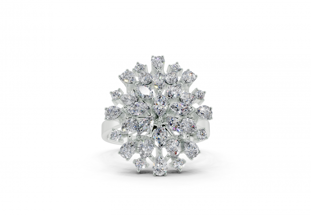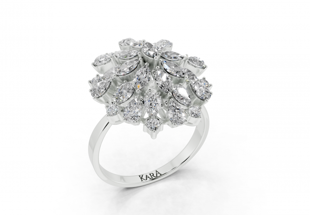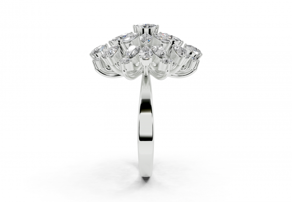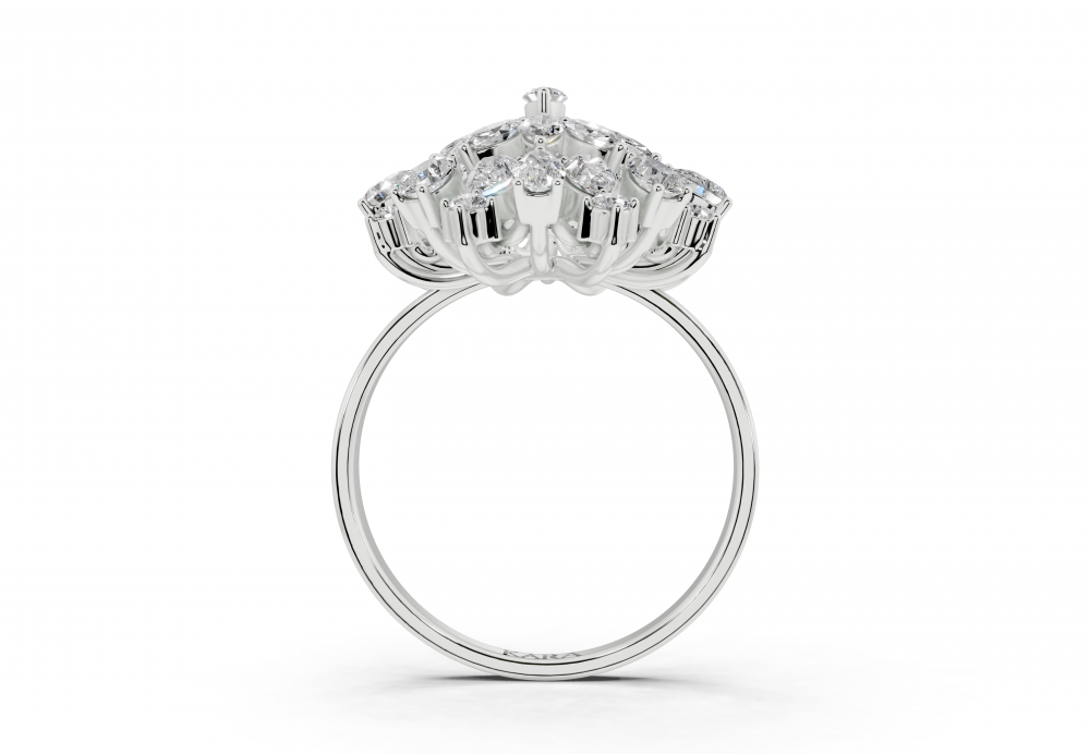 14K white gold ring with 0.83ct Pear Cut diamonds, 0.34ct Marquise Cut diamonds and 0.12ct round diamonds. Ring weight is approximately 5 grams. The ring can also be made to order in 18K gold. We can modify the design according to your budget.