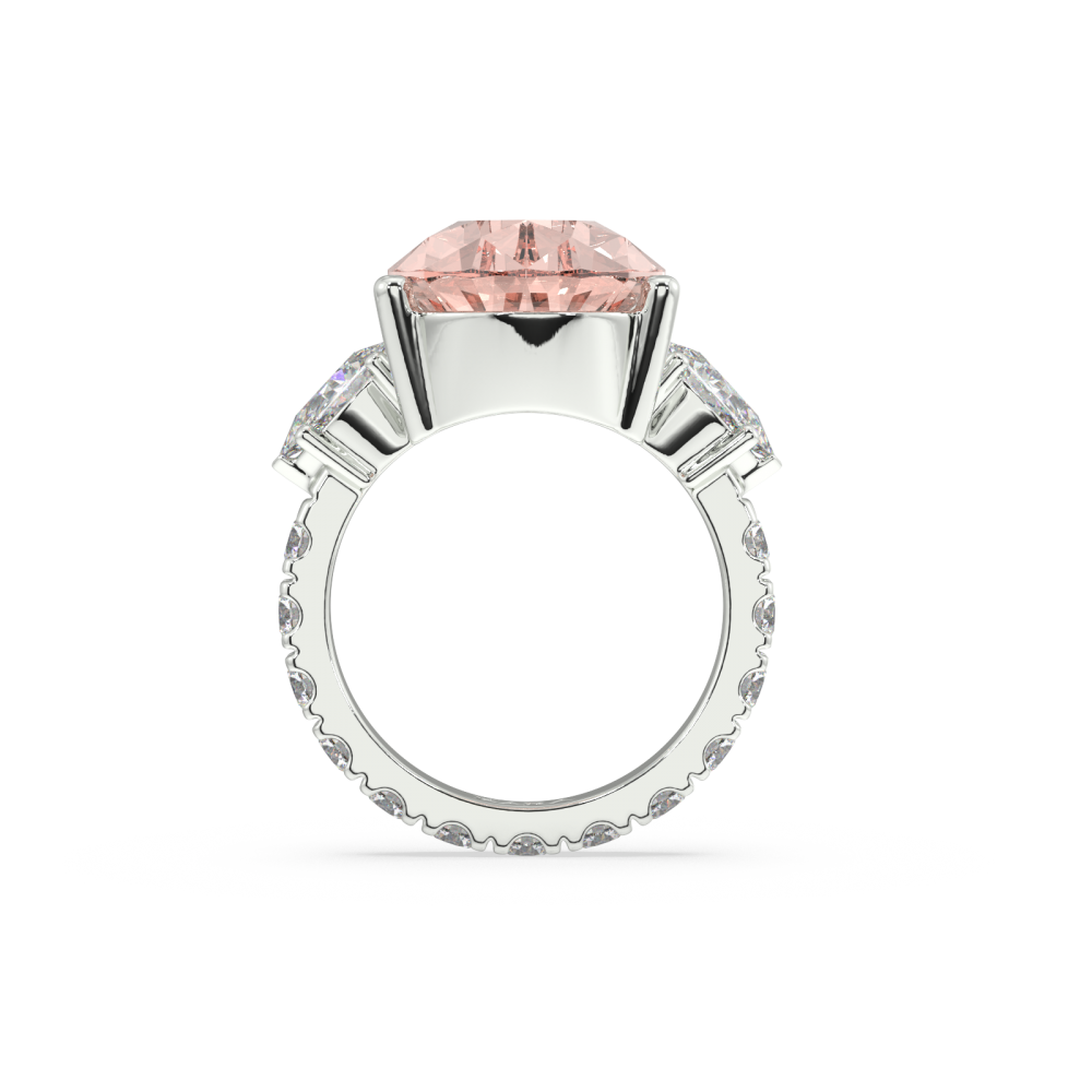 14K white gold ring with 10.07ct center Pear Cut Morganite, 1.29ct side Pear Cut diamonds and 1.32ct side round diamonds. The weight of the ring is approximately 9.60 grams. We can modify the design to suit your budget. We can choose the characteristics of the diamonds (cut, color, clarity,...