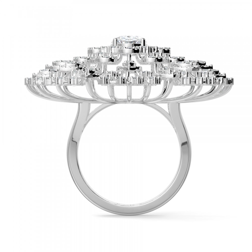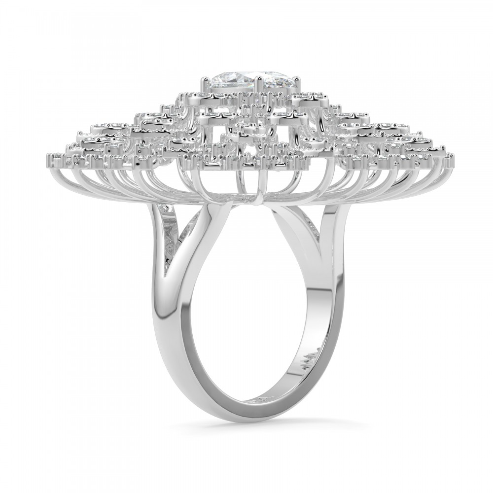 14 k white gold ring with 1.03 ct oval diamonds and 1.05 ct round diamonds. The weight of the ring is 10.30 grams. The ring can also be made to order in 18K gold. We can modify the design according to your budget.