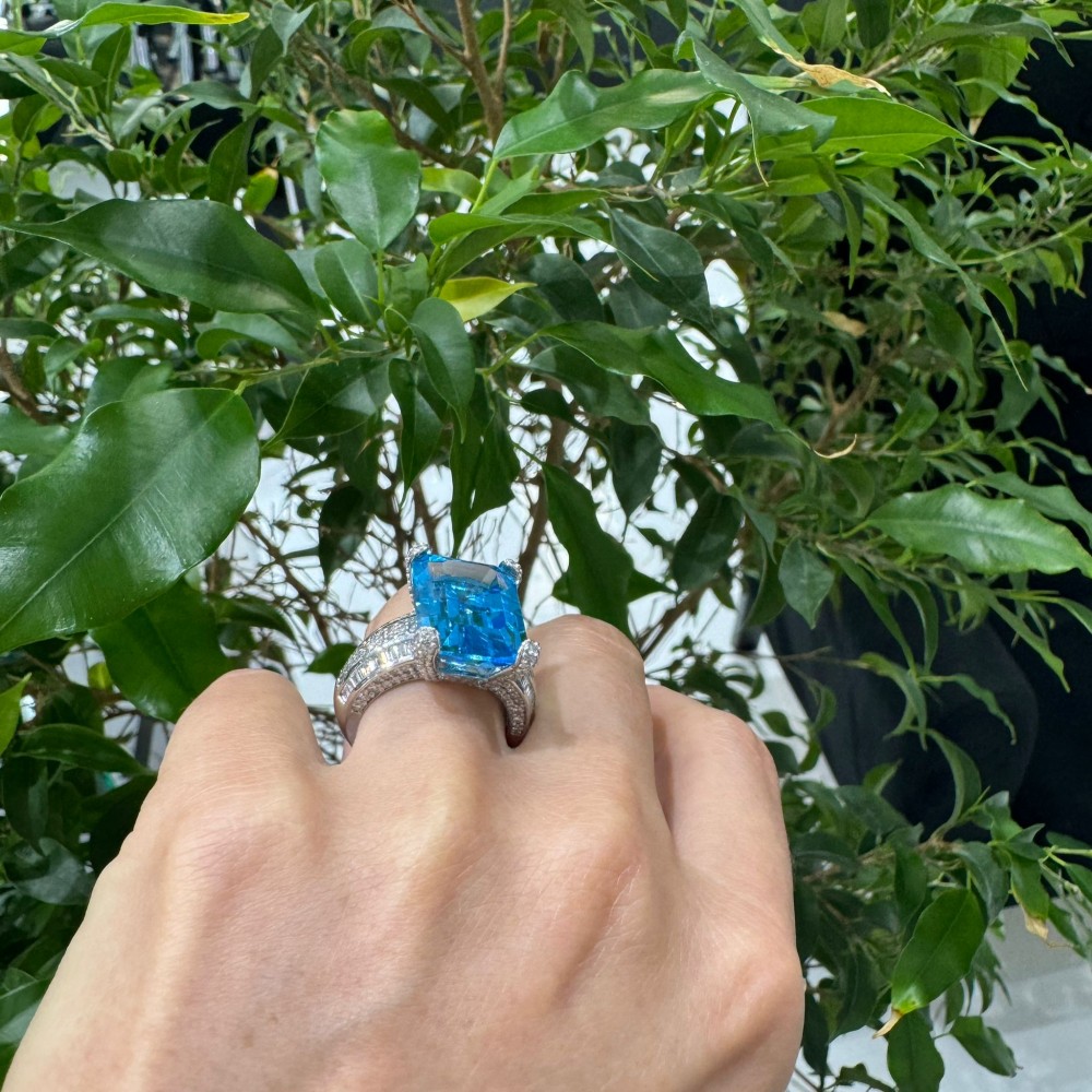 14K white gold ring with 1.22 ct round diamonds, 0.71 ct baget diamonds and 17.60 ct topaz.