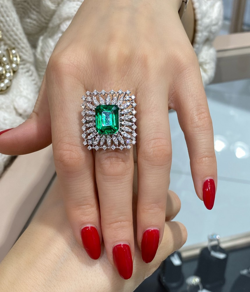 18K white gold ring with 1.32 ct. Diamonds and 7.03 ct. Green Citrine. Ring weight is 9.91 grams.
