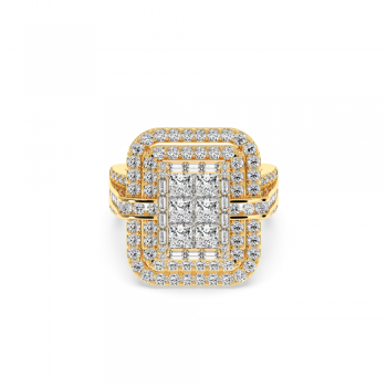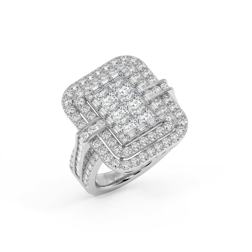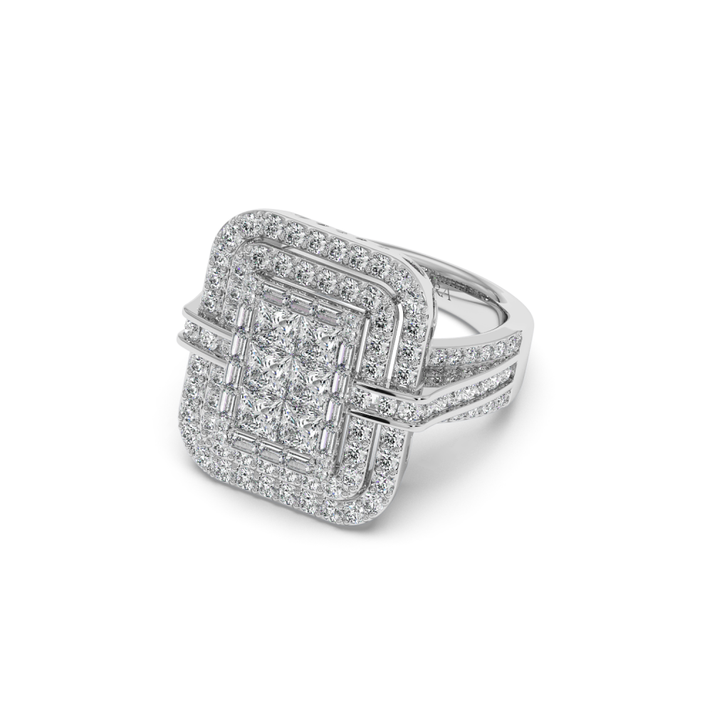 14K white gold ring with 1.54 ct round diamonds, 0.15 ct Baget diamonds and 1.20 ct Princess diamonds.