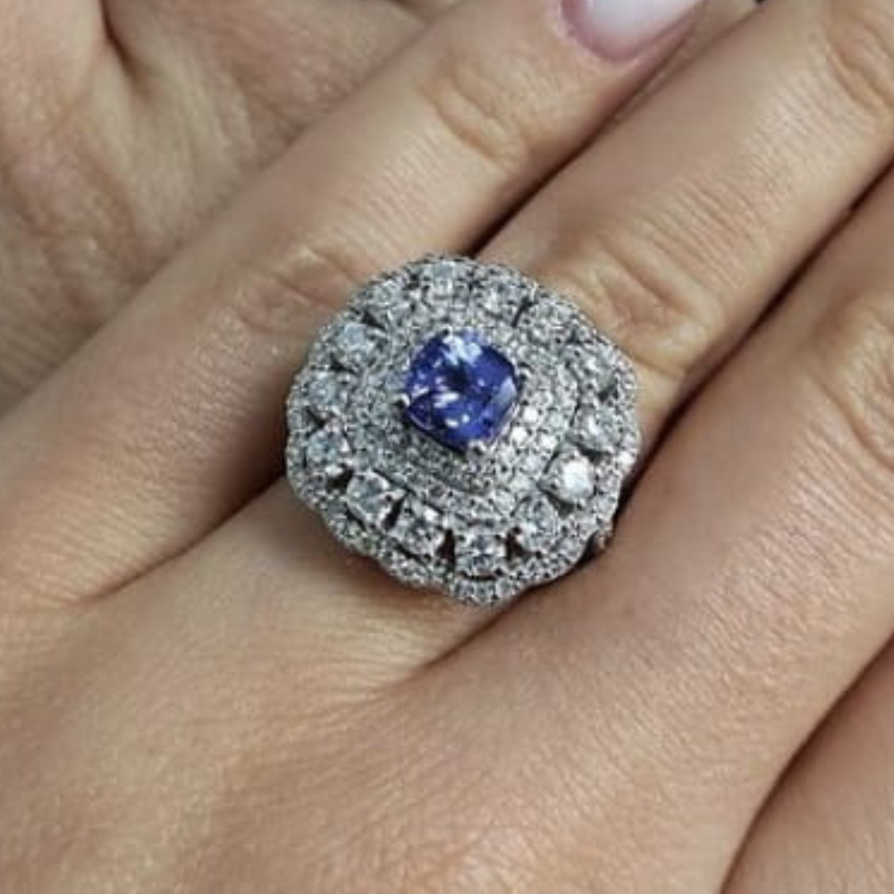 14K white gold ring with 2.29 ct diamonds and 1.14 ct Tanzanite. Ring weight is 9.30 grams.