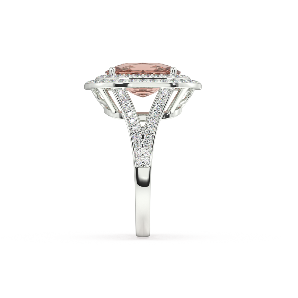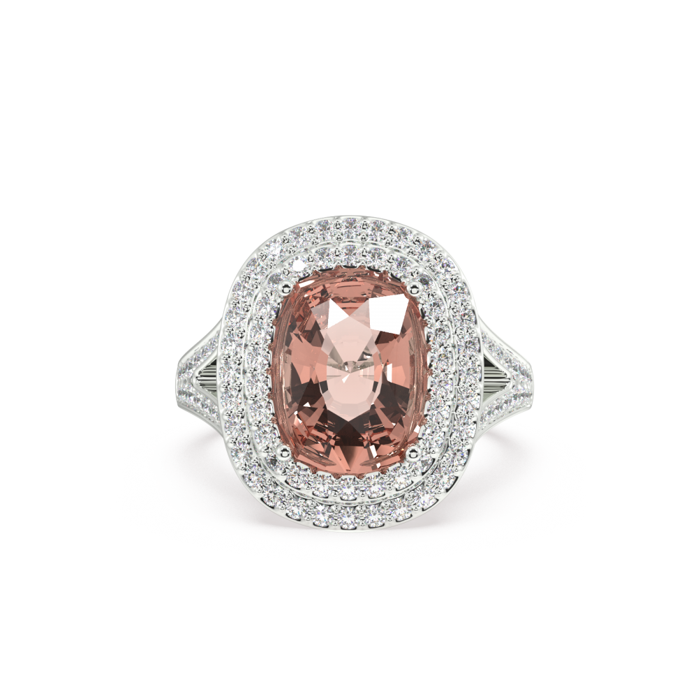 Ring in 14K white gold, with 5.43ct Morganite Cushion Cut in the center and 0.51ct round diamonds on the sides. Ring weight is approximately 7.60 grams. We can modify the design to suit your budget. We can choose the characteristics of the diamonds (cut, color, clarity, carat) to create the...