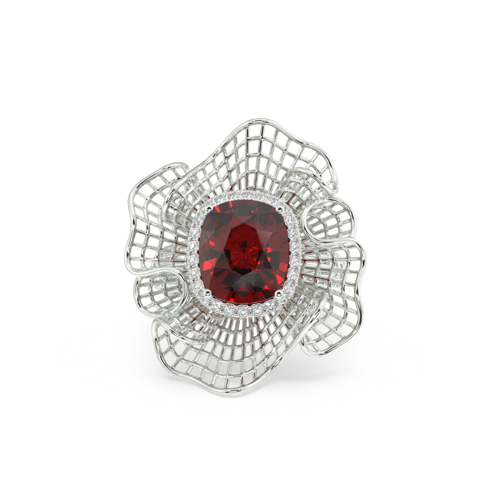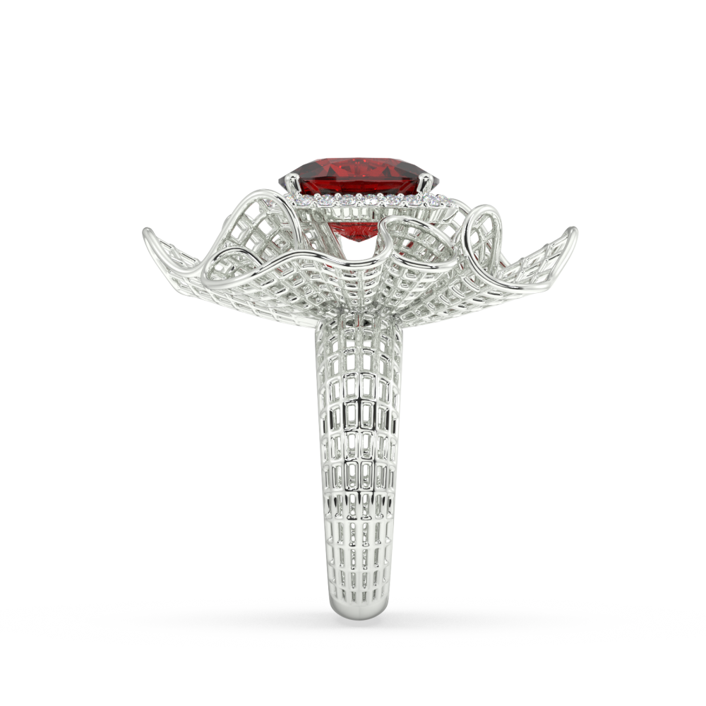 Ring in 14K white gold, with side diamonds of 0.21 ct and central ruby of 6.20 ct. Ring weight is approximately 12.50 grams.
