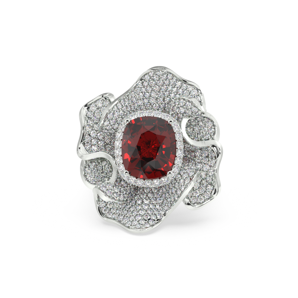 Ring in 14K white gold, with side diamonds of 0.41 ct and central ruby of 6.20 ct. Ring weight is approximately 14.50 grams. We can modify the design according to your budget. We can choose the characteristics of the diamonds (cut, color, clarity, carat) to create the perfect diamond ring....