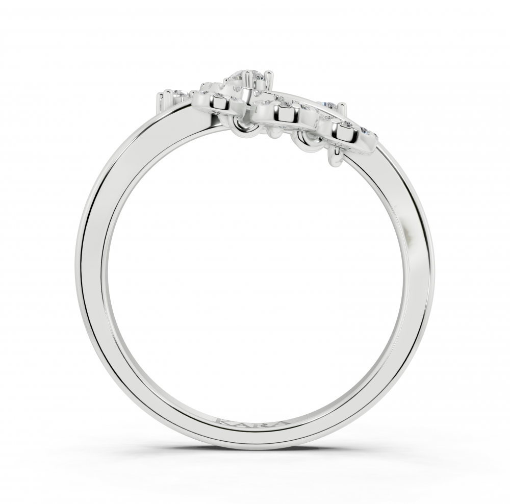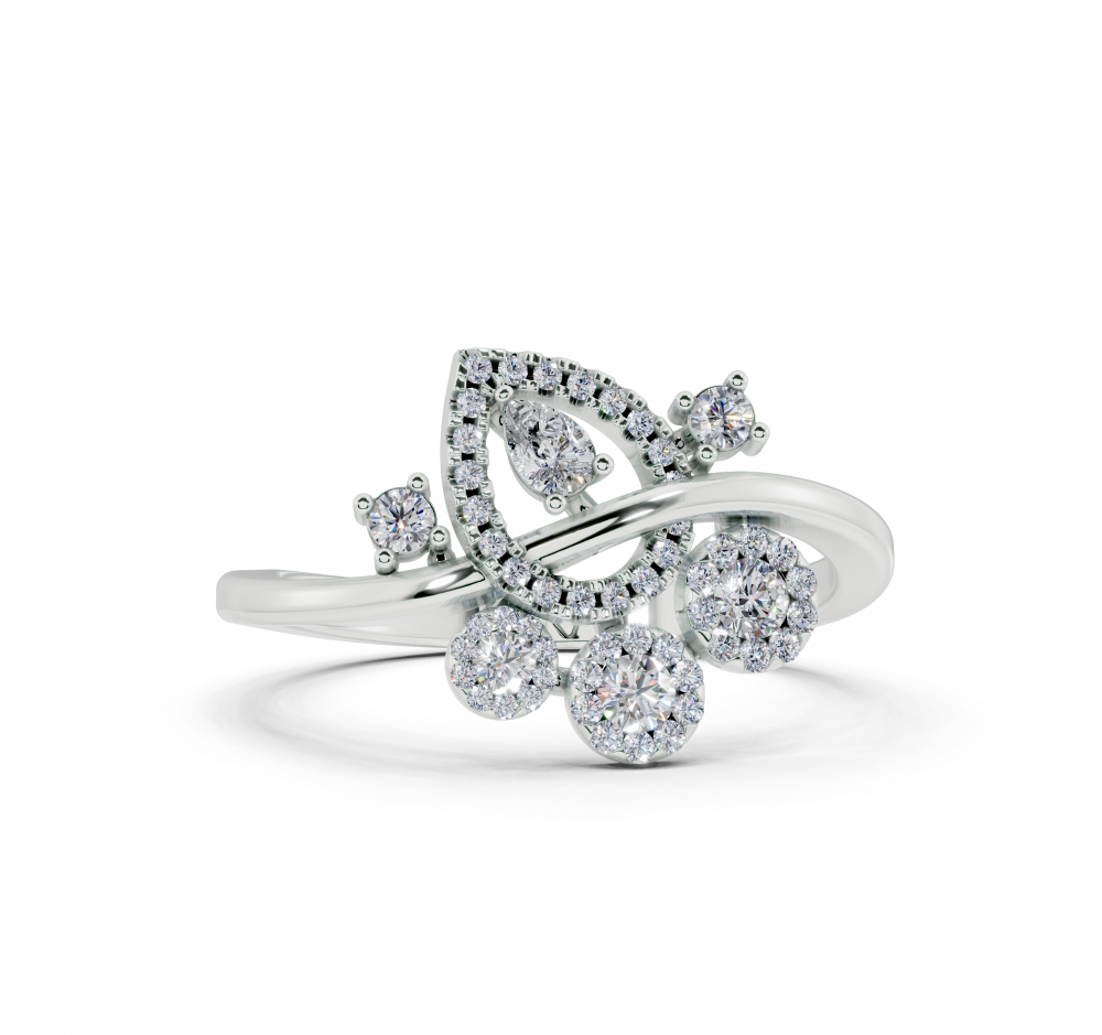 14K white gold ring with 0.05 ct Pear Cut diamonds and 0.24 ct round diamonds. Ring weight is approximately 2.50 grams. The ring can also be made to order in 18K gold. We can modify the design according to your budget.